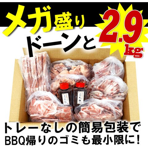 メガ盛り BBQ バーベキュー 肉 セット 2.9kg 焼肉 精肉 10人前以上 大人数用 牛肉 カルビ・豚肩ロース・豚バラ・鶏もものお肉4種+お肉屋さんのタレ2本付き 送料無料 BBQ食材 セット 焼き肉