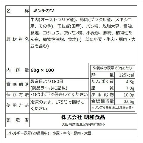 業務用 ケース 肉 牛肉 豚肉 惣菜 冷凍 無添加 メンチカツ お肉屋さんのミンチカツ 60g×100個 お弁当 おかず グルメ