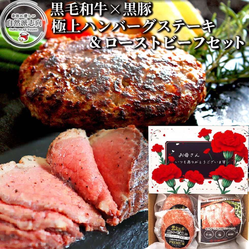 至福の特選ディナーセット 無添加 黒毛和牛 黒豚 極上ハンバーグ 140g×2 ローストビーフ 150g 高級 お取り寄せ グルメ プレゼント 冷凍 食品 肉 惣菜 通販 内祝い 贈答 ギフト 送料無料