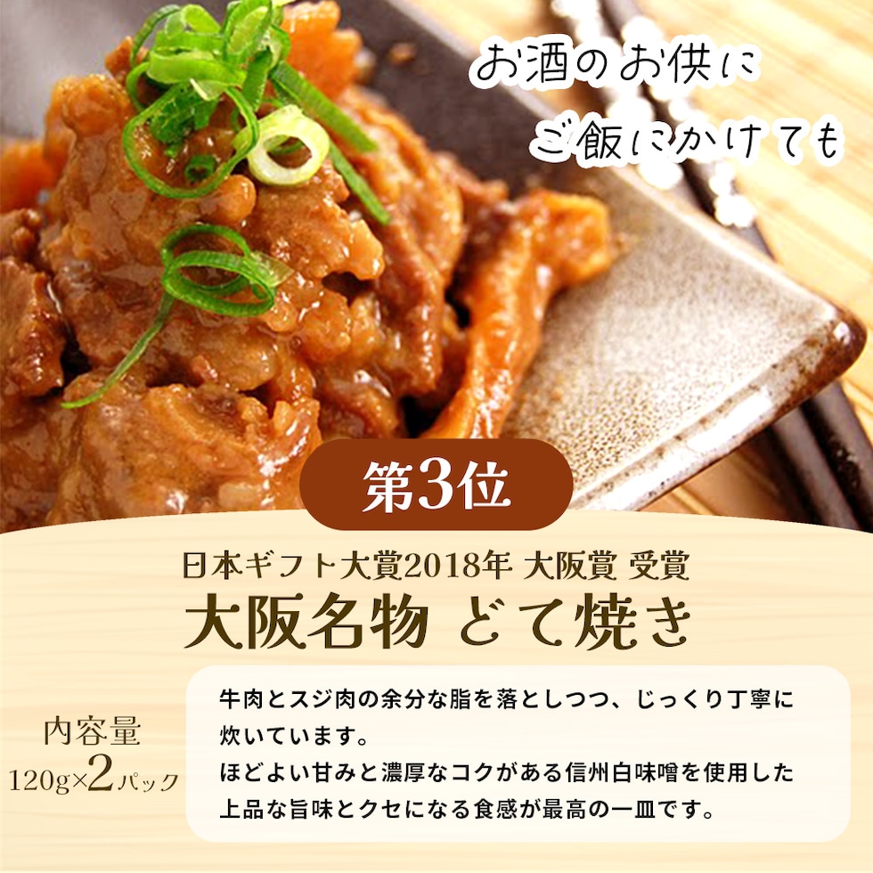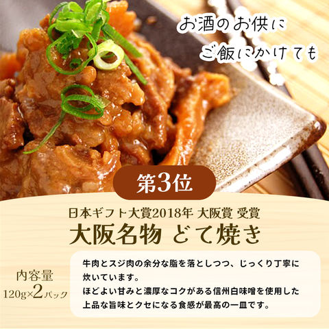 | 大阪名物どて焼き | 120g × 2パック | 牛スジ肉(豪州)、牛肉(豪州)、味噌、みりん、醤油、砂糖、玉ねぎ、ごま油、トマトピューレ、リンゴピューレ、コーンスターチ、ワイン、豆板醤、生姜、ニンニク、塩、コショウ、酢 (一部に小麦・牛肉・大豆・ゴマ・リンゴを含む) |