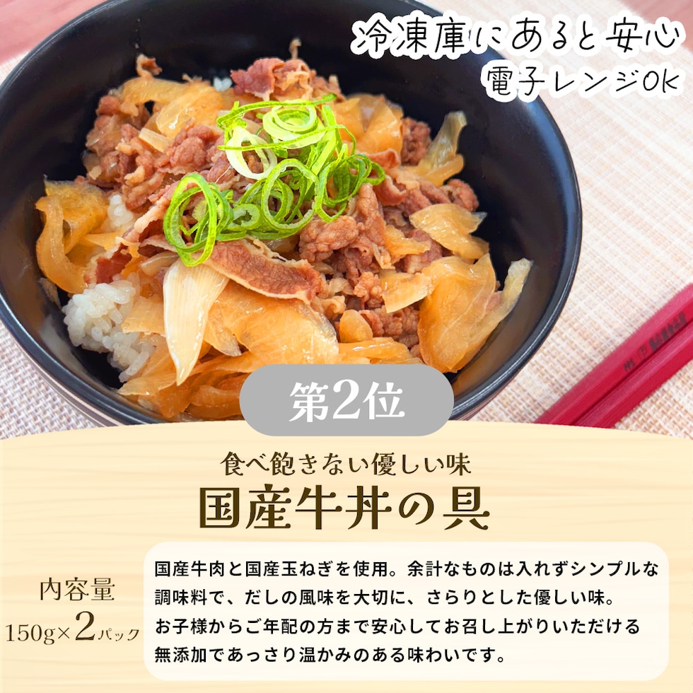 | 国産牛丼の具 | 150g × 2パック | 牛肉(国産)、玉葱(国産)、醤油、みりん、砂糖、ワイン、生姜、かつおだし、(一部に小麦・牛肉・大豆を含む) |
