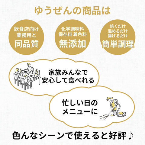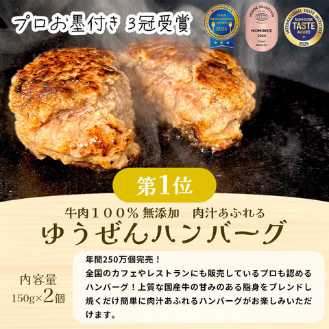 | ゆうぜんハンバーグ | 150g × 2個 | 牛肉(外国産・国産)、玉ねぎ(国産)、全卵(国産)、パン粉、牛乳、醤油、食塩、胡椒 (一部に小麦・卵・乳成分・牛肉・大豆を含む) |