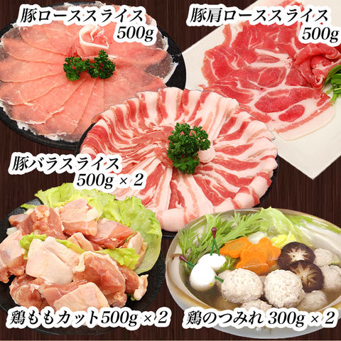【豚ローススライス】 500g×1パック 【豚肩ローススライス】500g×1パック 【豚バラスライス】 500g×2パック 【鶏ももカット済】 500g×2パック 【鶏のつみれ】 300g×2パック |
