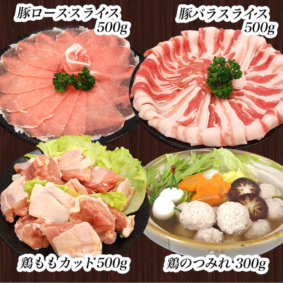【豚ローススライス】 500g×1パック 【豚バラスライス】 500g×1パック 【鶏ももカット済】 500g×1パック 【鶏のつみれ】 300g×1パック |
