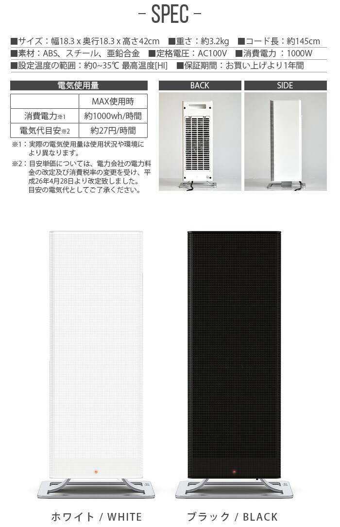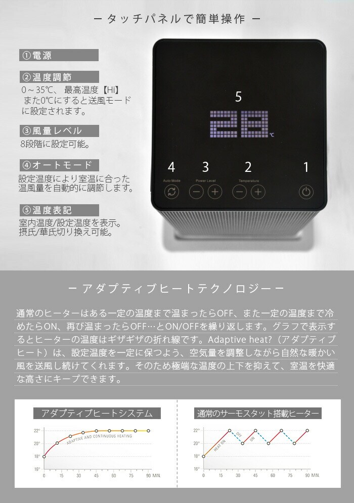 ■備考…・アダプティブヒートテクノロジー/温度過昇防止用サーモスタット/PTCヒーター(半導体セラミック)/転倒時自動電源オフ/送風運転/タッチパネル
