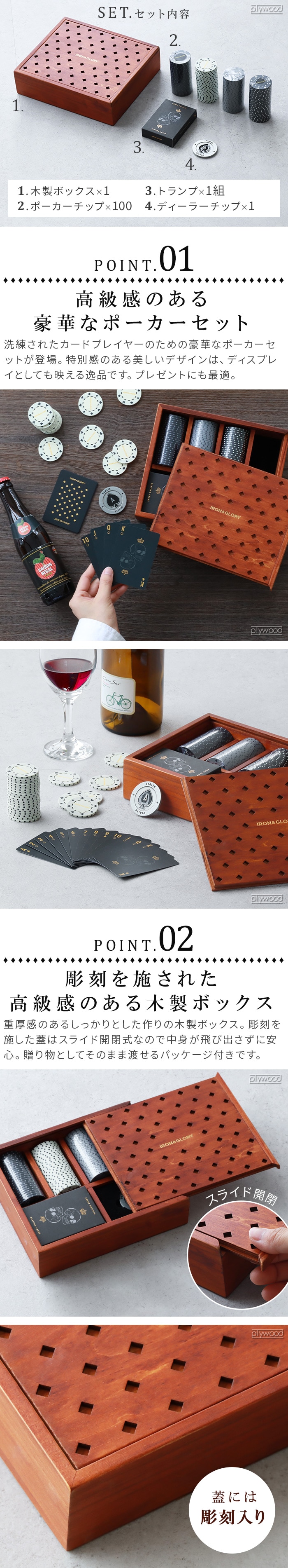 | 木製ボックス×1、トランプ×1組、ポーカーチップ×100枚(4色×25枚)、ディーラーチップ×1枚 |