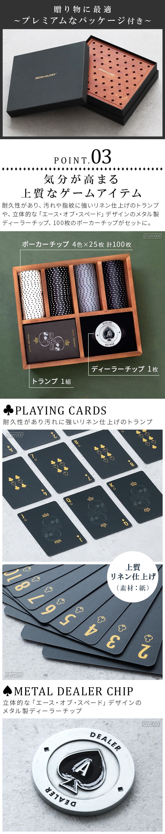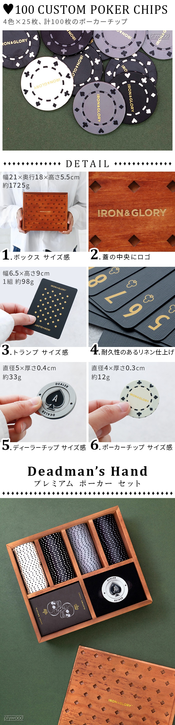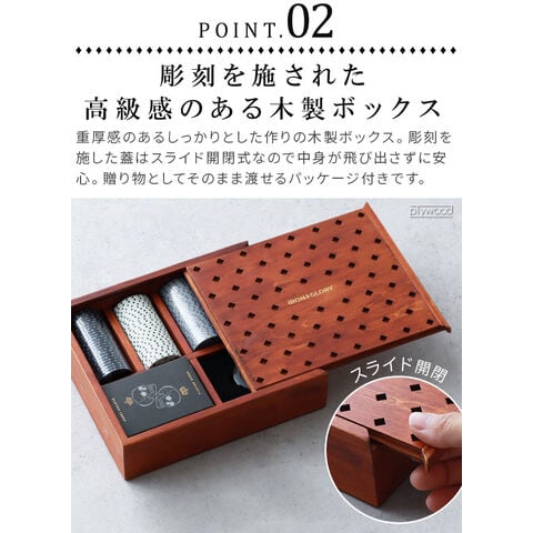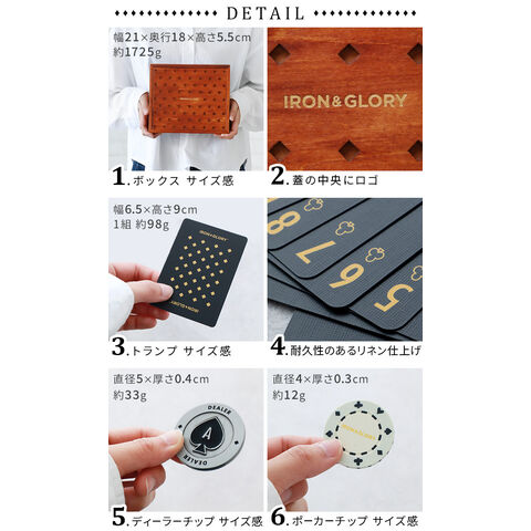 ボックス:木 トランプ:紙 ポーカーチップ:メタル ディーラーチップ:メタル |