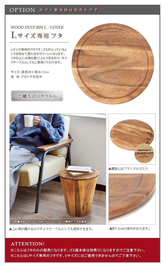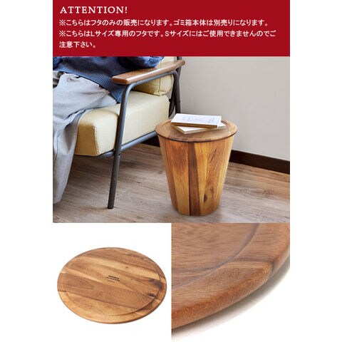 ■ご注意…こちらはフタのみの販売になります。ゴミ箱本体は別売りになりますのでご注意下さい。/こちらはLサイズ専用のフタです。Sサイズにはご使用できませんのでご了承下さい。/天然の木材を使用しているため、一点一点色合いや木目が異なります。/本体の表面に多少の傷やザラつきがある場合がありますが、通常の使用に問題はありません。 あらかじめご了承の上、お買い求めくださいませ。