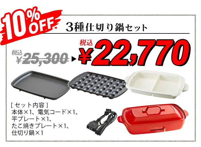 ブルーノ ホットプレート グランデサイズ 本体&3種仕切り鍋セット BRUNO Hot Plate Grande size ≪レッド BOE026≫ ホットプレート