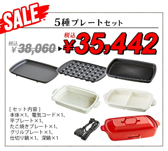 ■付属品…平面プレート×1、たこ焼きプレート(全35穴)×1、グリルプレート×1、仕切り鍋×1、深鍋×1、フタ×1、フタ用取っ手×1、マグネット式脱着電源コード×1