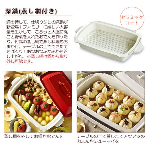 ■素材…本体:スチール、フェノール樹脂/プレート:アルミダイキャスト/仕切り鍋・深鍋(内側表面セラミックコート):アルミダイキャスト、フェノール樹脂、ステンレススチール