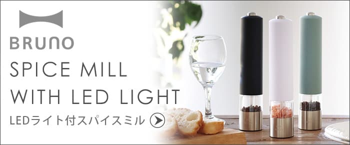 片手でカンタンに操作できる 電動スパイスミル BRUNOから、ボタンひとつで挽ける電動スパイスミルの登場です。 中が半分に仕切られているので、1つのボトルに種類の違うスパイスなどを入れることが出来ます。ボタンひとつの簡単操作で、調理中でも片手でスパイスが挽けます。落ち着いたカラーでダイニングにも馴染み、ギフトにもおすすめです。 |