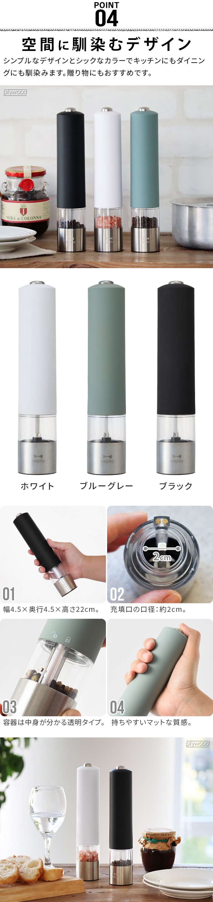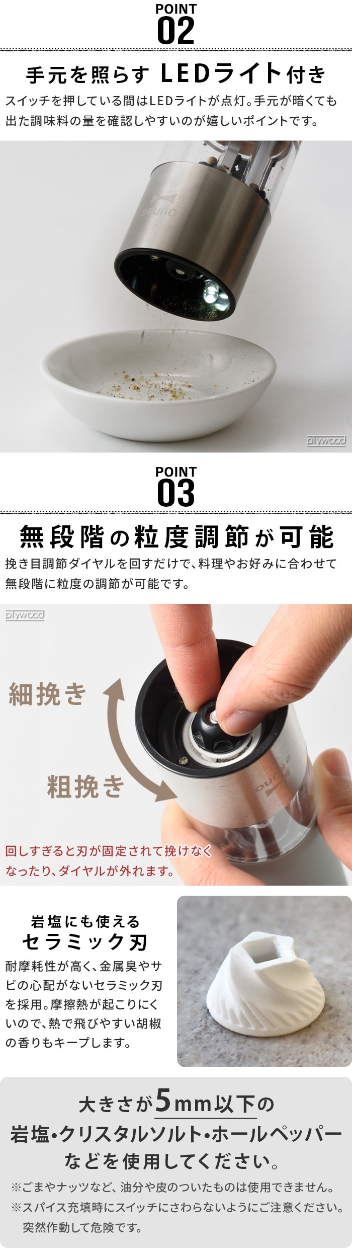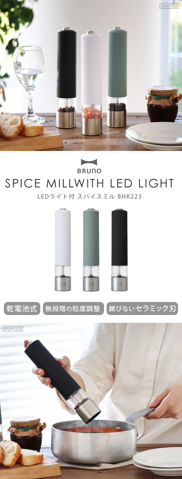 BRUNO LEDライト付スパイスミル ≪ブラック BHK223≫ ブルーノ 電動ミル ソルト ペッパー ミル 乾電池タイプ セラミック刃 粗さ調整 ギフト