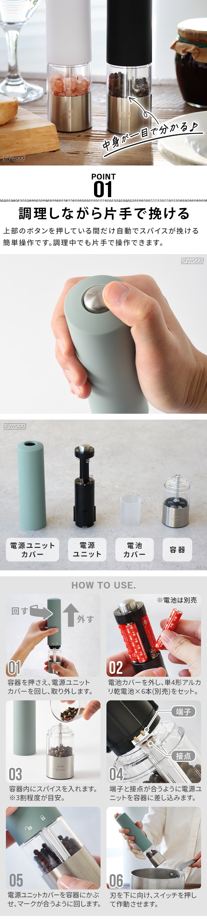 スパイスをを入れる量は容器の3割程度にしてください。 5mm以下の岩塩・クリスタルソルトやホールペッパーを使用してください。 ごまやナッツなど油分や皮のついたものには使用できません。 スパイス充填時にスイッチにさわらないようご注意ください。突然作動して危険です。 マンガン乾電池およびニッケル水素充電池は使用できません。 異なるブランド、種類、新旧の電池を混在しないでください。誤作動や故障、液漏れ等の原因になります。 |