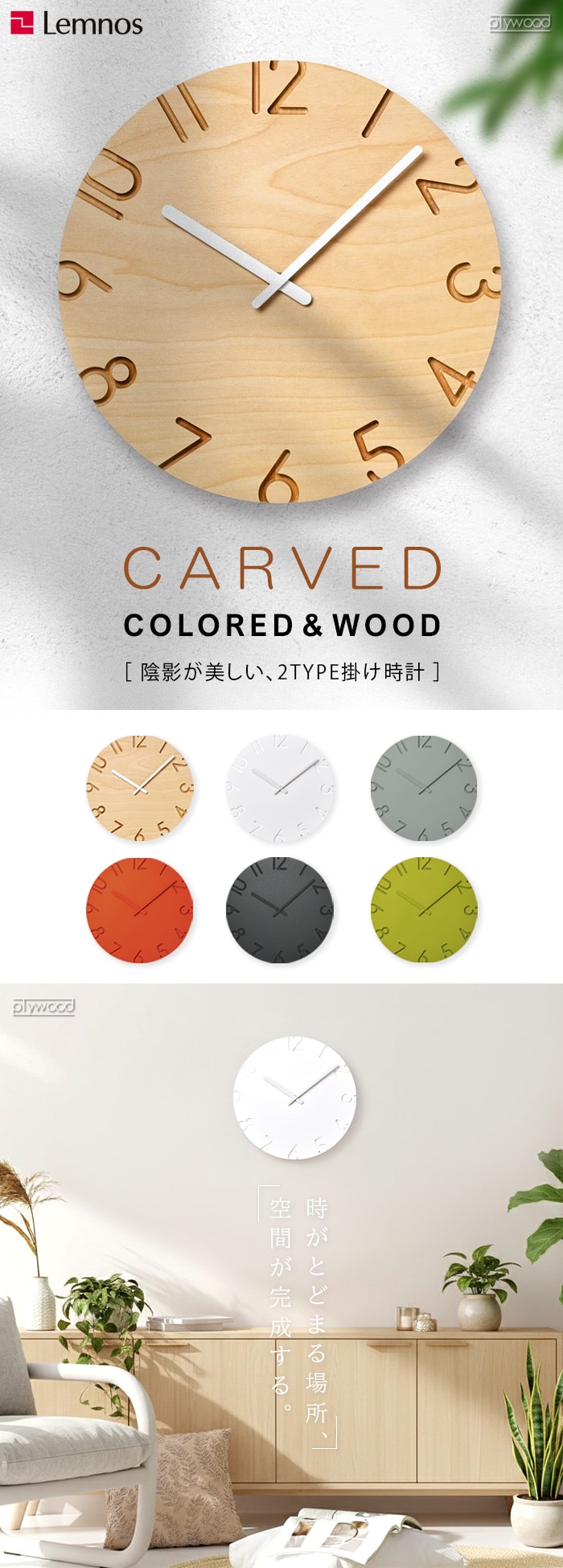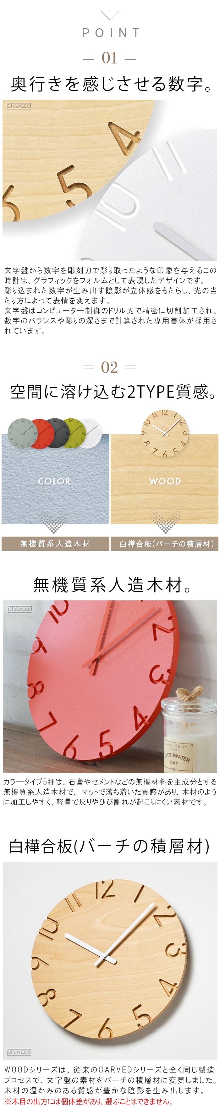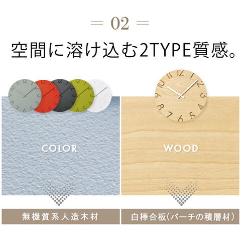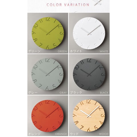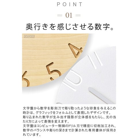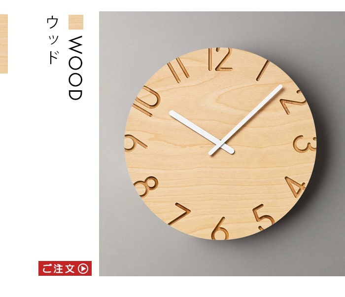 陰影が美しい、 ナチュラルとモダンの2タイプ掛け時計。 数字を彫刻刀で彫り取ったような陰影が文字盤に立体感を与えます。 ナチュラルとモダン、2タイプのデザインから選べるクラシックな掛け時計。 |