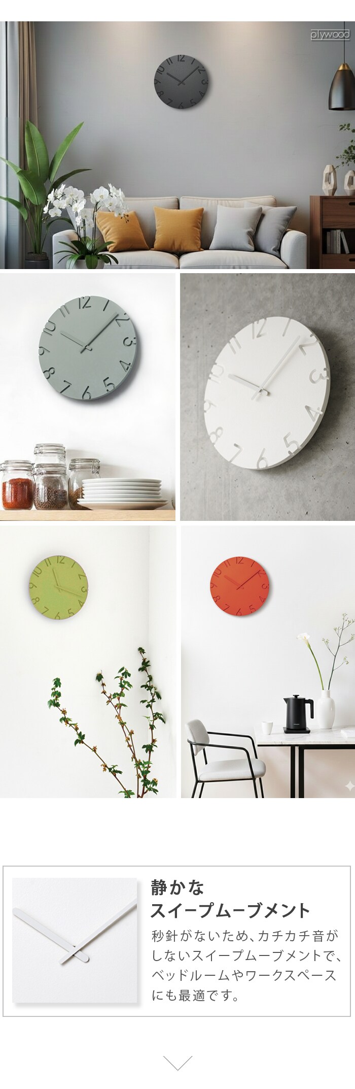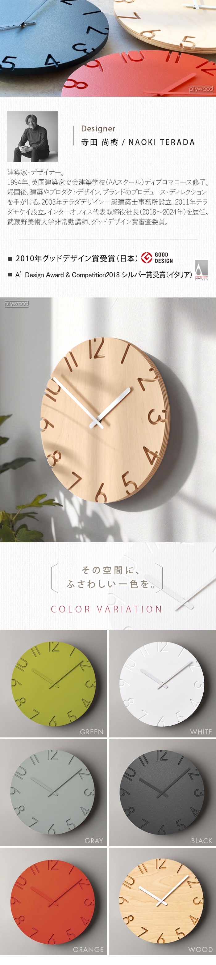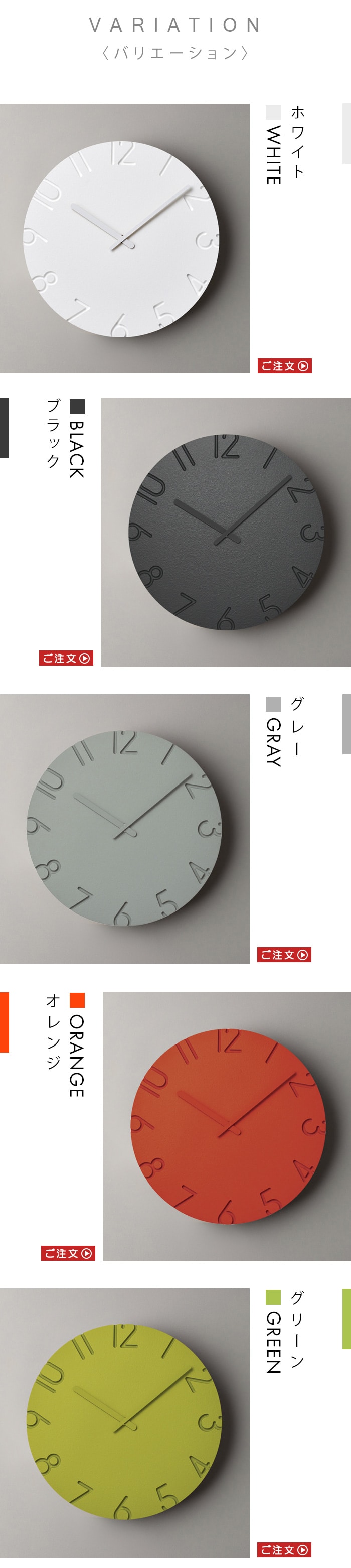 陰影が美しい、 ナチュラルとモダンの2タイプ掛け時計。 数字を彫刻刀で彫り取ったような陰影が文字盤に立体感を与えます。 ナチュラルとモダン、2タイプのデザインから選べるクラシックな掛け時計。 |