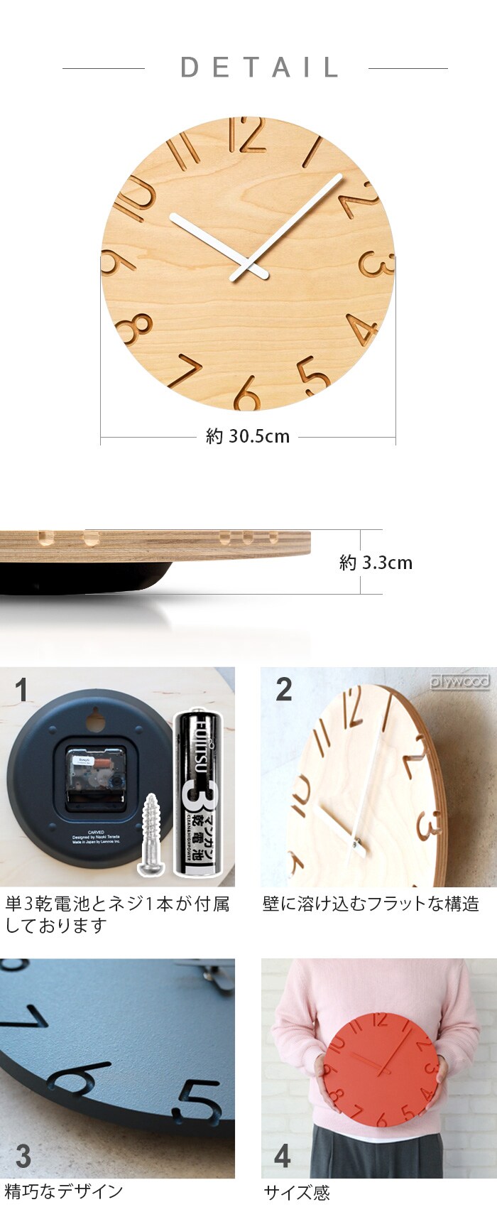 | 木目の出方には個体差があり、お選びいただくことはできません。また返品交換はお受けできませんのでご了承の上お買い求めください。 時計を掛ける時は垂直に掛けて下さい。傾くと掛け具合から外れる恐れがあります。掛けたときは、上下、左右に軽く動かして、壁掛け穴に壁掛け用木ネジ(掛け具)がしっかり掛かっていることを確認して下さい。 |