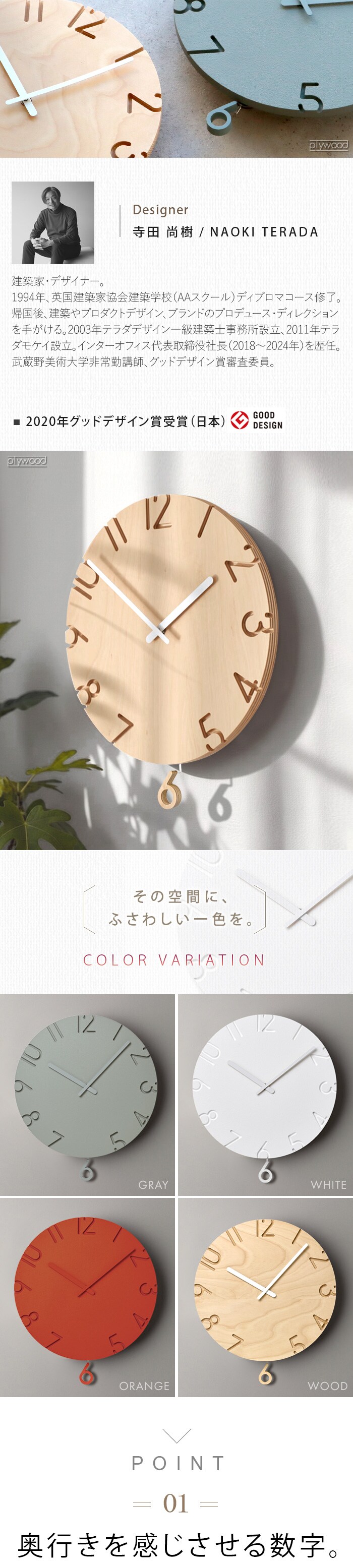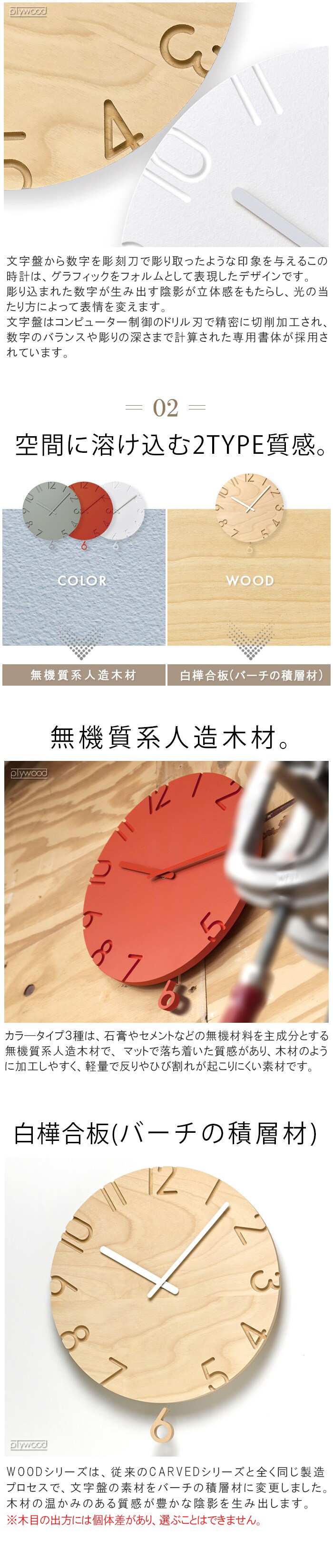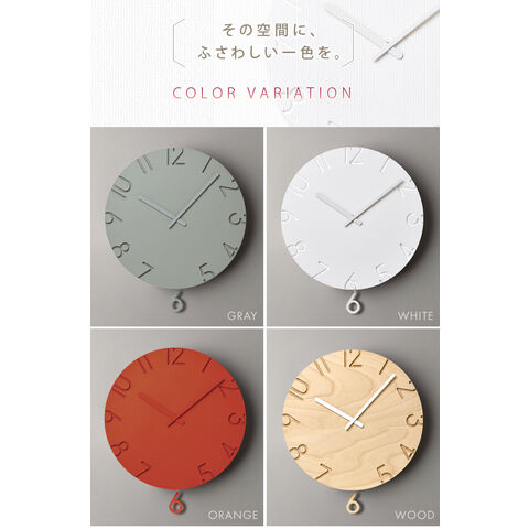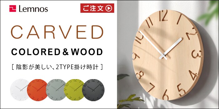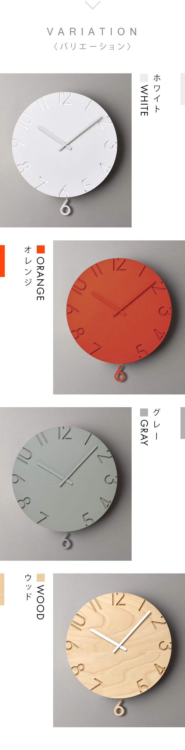 2タイプの掛け時計。 数字を彫刻刀で彫り取ったような陰影が文字盤に立体感を与えます。 数字の「6」を時計の外に突き出し、躍動感のある動きを振り子で表現した 2タイプの掛け時計です。 |