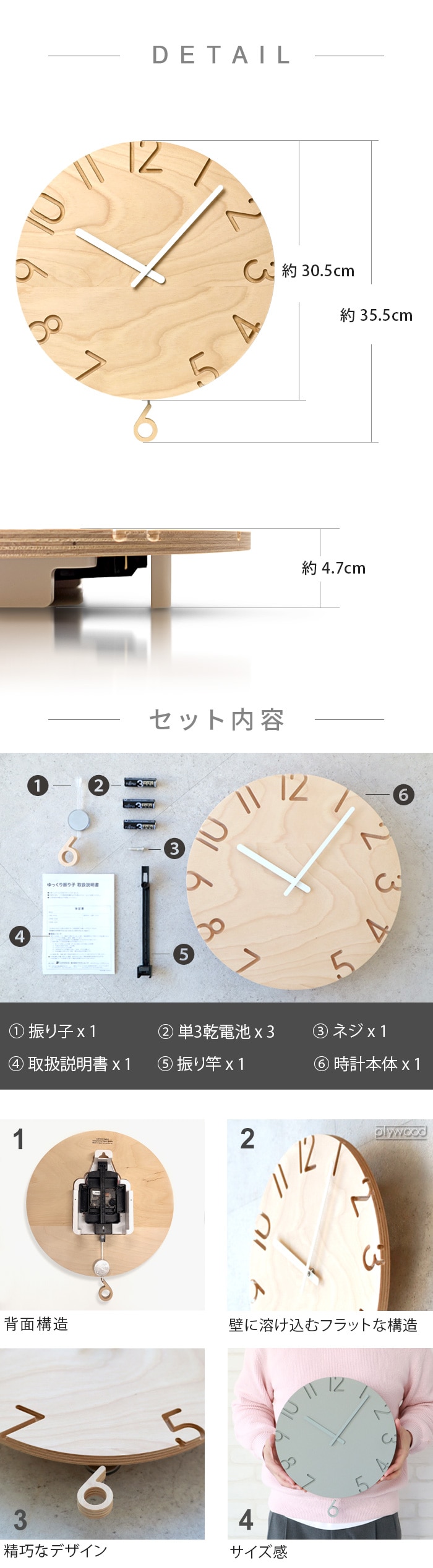 | 木目の出方には個体差があり、選ぶことはできません。 時計を掛ける時は垂直に掛けて下さい。傾くと掛け具合から外れる恐れがあります。掛けたときは、上下、左右に軽く動かして、壁掛け穴に壁掛け用木ネジ(掛け具)がしっかり掛かっていることを確認して下さい。 |
