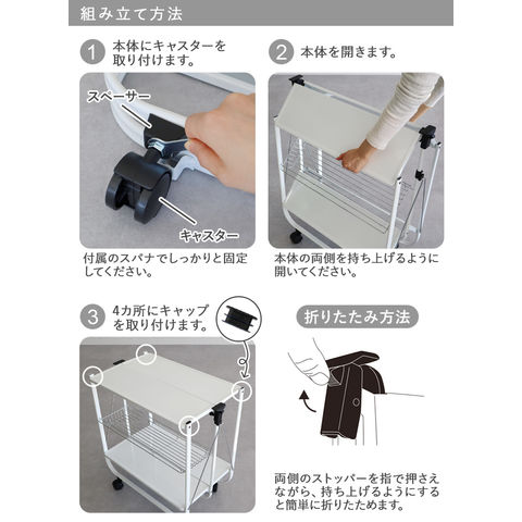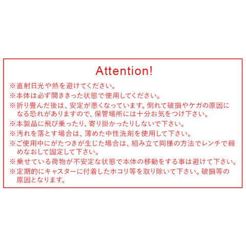 | 直射日光や熱を避けてください。 本体は必ず開ききった状態で使用してください。 折り畳んだ後は、安定が悪くなっています。倒れて破損やケガの原因になる恐れがありますので、保管場所には十分お気をつけください。 本製品に飛び乗ったり、寄り掛かったりしないでください。 汚れを落とす場合は、薄めた中性洗剤を使用してください。 ご使用中にがたつきが生じた場合は、組み立て同様の方法でレンチで締めなおして固定してください。 乗せている荷物が不安定な状態で本体の移動をする事は避けてください。 定期的にキャスターに付着したホコリ等を取り除いてください。破損等の原因となります。 直射日光又は熱を避けてください。 |