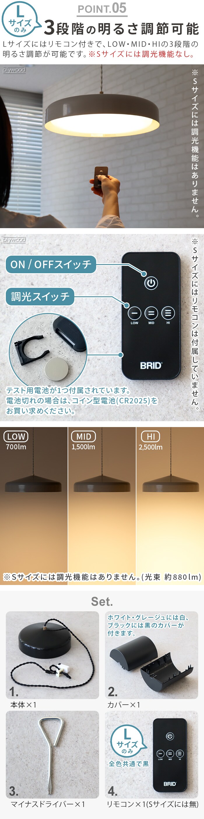 [Sサイズ] 光束:約880lm 消費電力:約9W 電球色:3,000K ※Sサイズには調光機能はありません。 [Lサイズ] 光束:約700/1,500/2,500 lm 消費電力:約6/12/20W 電球色:3,000K |