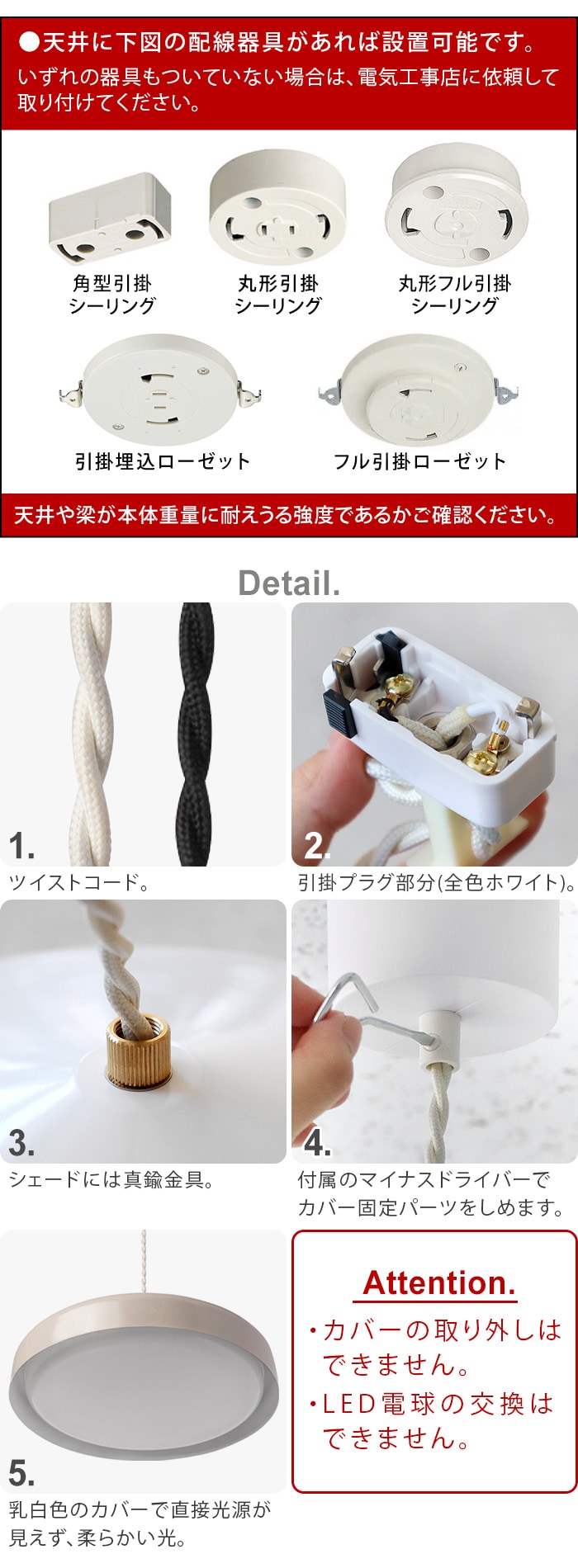 カバーの取り外しはできません。 LED電球の交換はできません。 器具落下の原因になりますので、傾斜のある天井や、傾斜を合わせた舟底天井には絶対に取付けないでください。 落下防止の為、各パーツが確実に接続されているか再度点検の上ご使用ください。 |