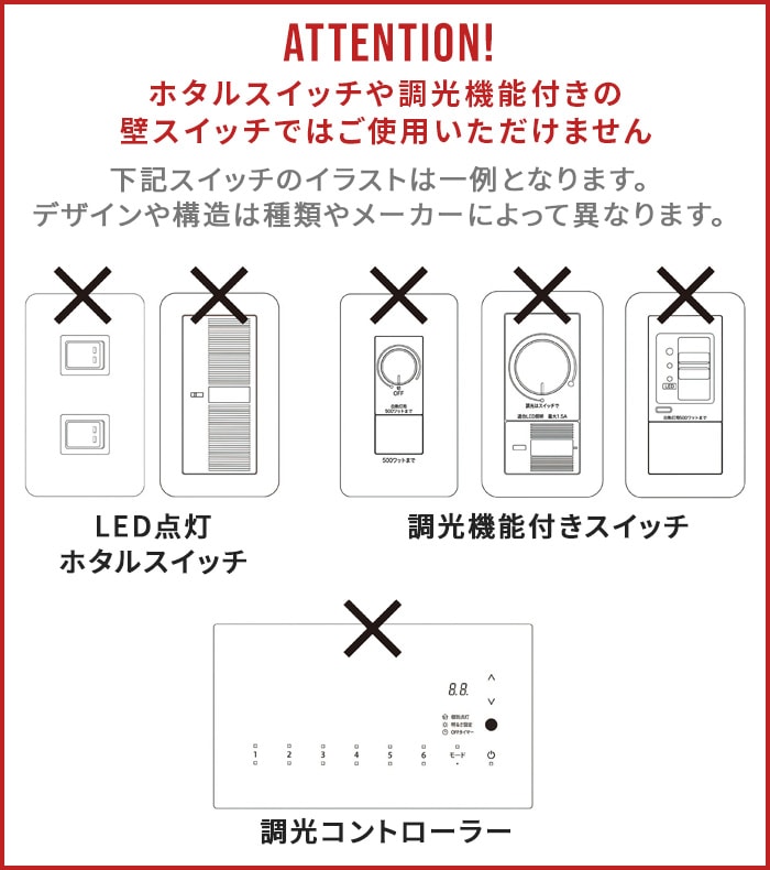 | 本製品は、一般屋内ライティングダクト専用天井直付器具です。注意事項をよくお読みになってご使用ください。 調光器(ライトコントロール)との併用は出来ません。 ホタルスイッチ、調光機能付きスイッチ、調光コントローラーの壁スイッチではご使用いただけません。 取付の際には壁スイッチを「OFF」した状態で設置をお願いします。壁スイッチが「ON」になっている場合、レールに取り付けた時点で羽根が回転し始めますのでご注意ください。 調光機能付きには使用不可になります。予めご了承下さい。 取り付け方向を間違えますと外れなくなります。また無理に外そうとすると破損の原因となります。ご注意ください。 本製品(付属品を含む)は日本国内専用器具です。海外の規格には準拠しておりません。表示された電源電圧以外では絶対に使用しないでください。器具の破損、故障の原因になることがあります。 |
