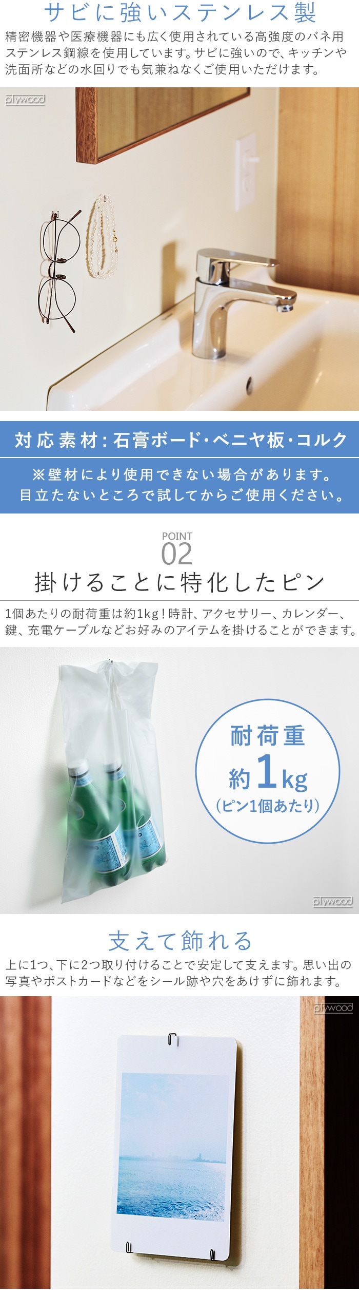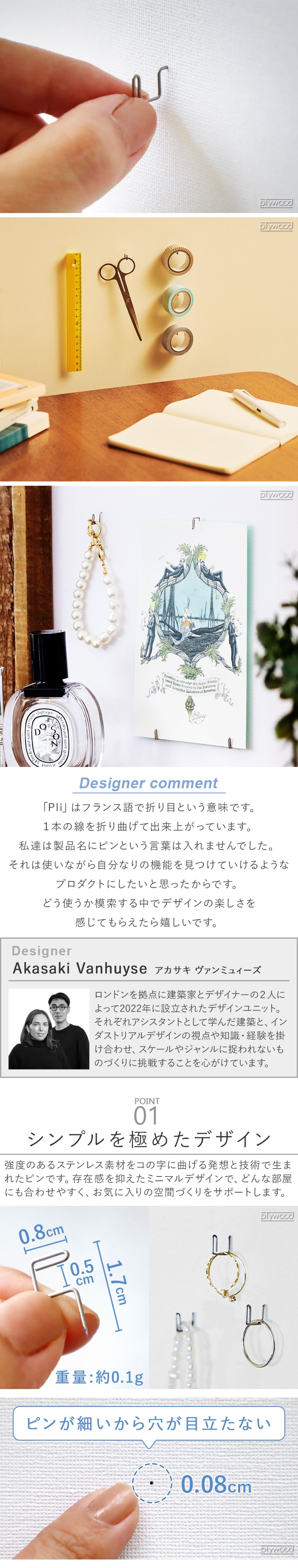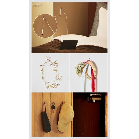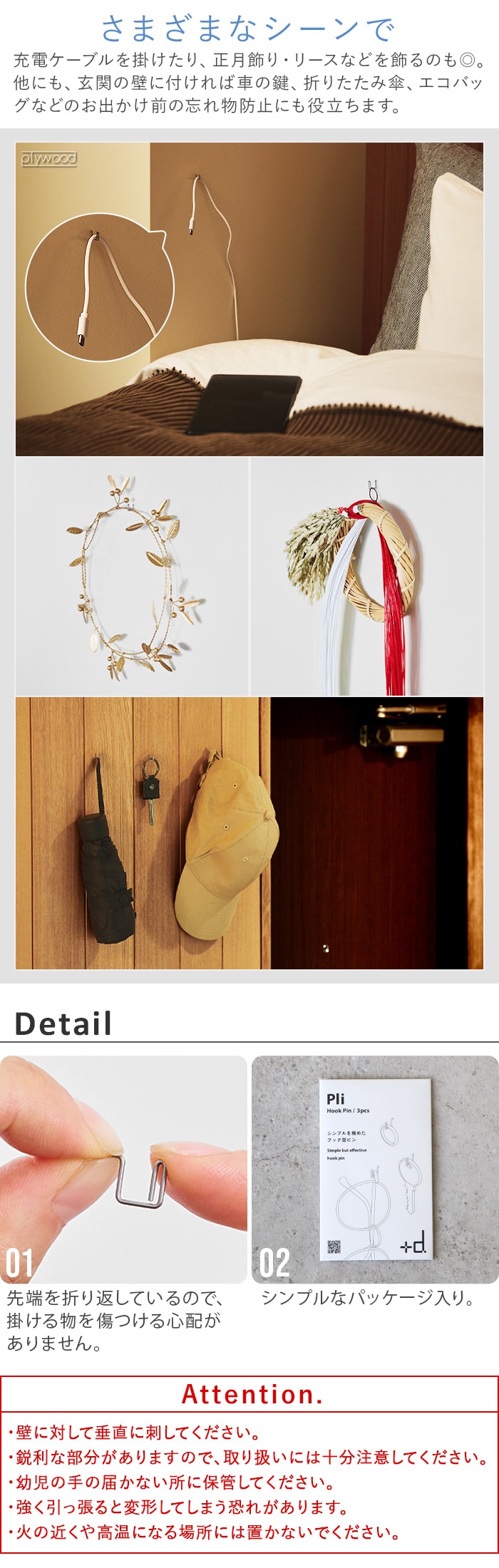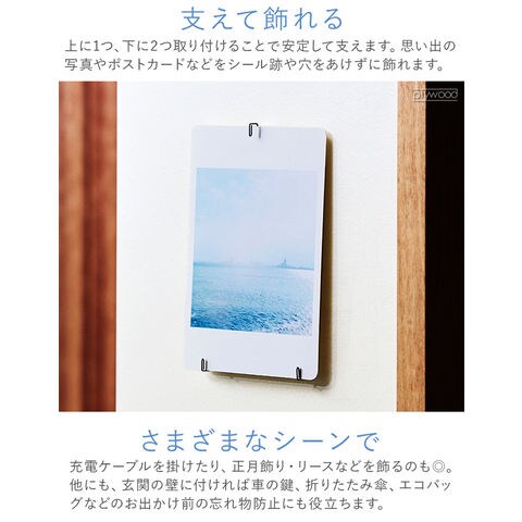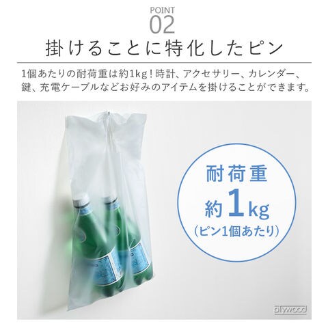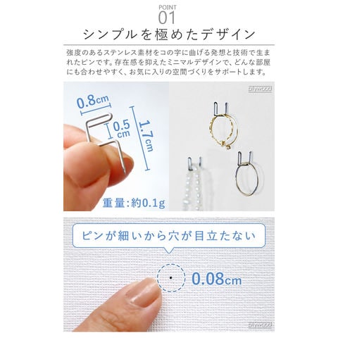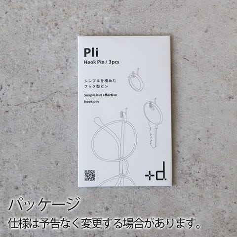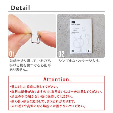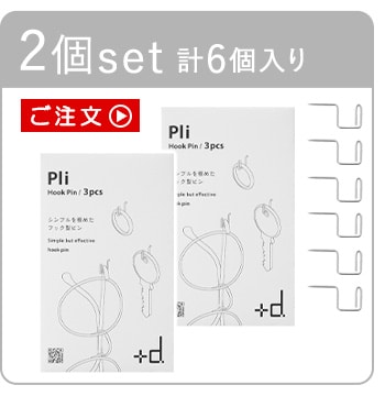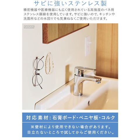 +dから、物を掛けることに特化したフック型のピンのご紹介です。ミニマルなデザインで、どんなインテリアにもマッチ!精密・医療機器などにも広く使用されている、高強度のバネ用ステンレス鋼線を採用。サビに強く、水回りでも使用できます。耐荷重は約1kg!アクセサリー、鍵、充電ケーブル...色々なアイテムをお好きなウォールに引っ掛け収納できます♪