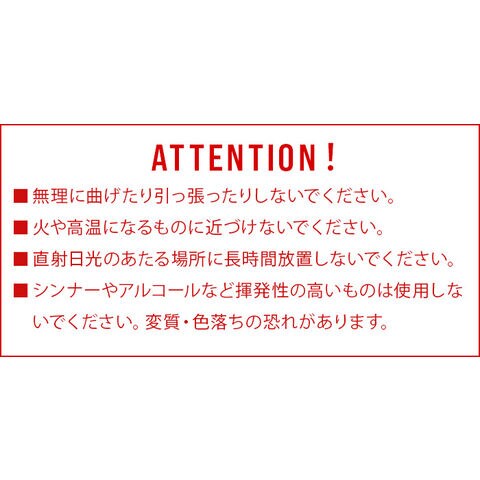 本来の用途以外には使用しないでください。 無理に曲げたり引っ張ったりしないでください。 火や高温になるものに近づけないでください。 直射日光のあたる場所に長時間放置しないでください。 シンナーやアルコールなど揮発性の高いものは使用しないでください。変質・色落ちの恐れがあります。 |