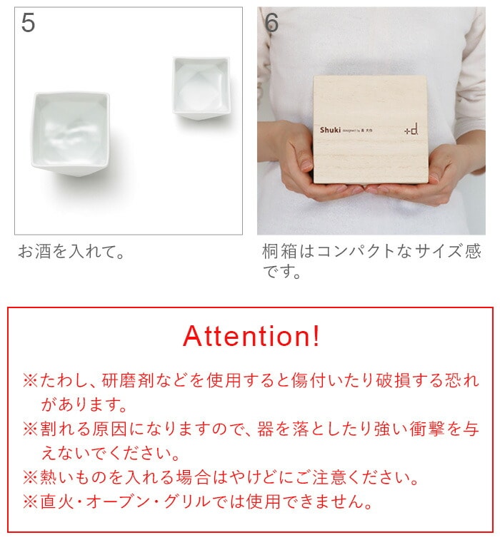 | たわし、研磨剤などを使用すると傷ついたり破損する恐れがあります。 割れる原因になりますので、器を落としたり強い衝撃を与えないでください。 熱いものを入れる場合はやけどにご注意ください。 直火・オーブン・グリルでは使用できません。 |