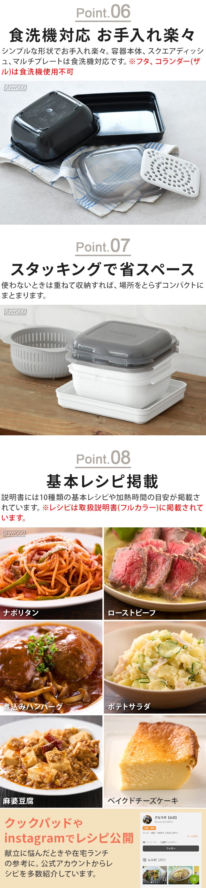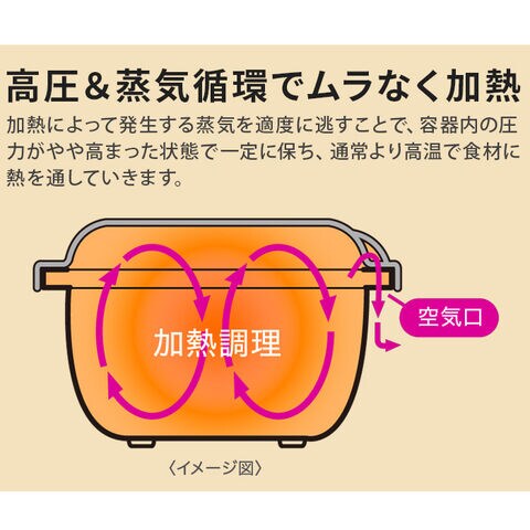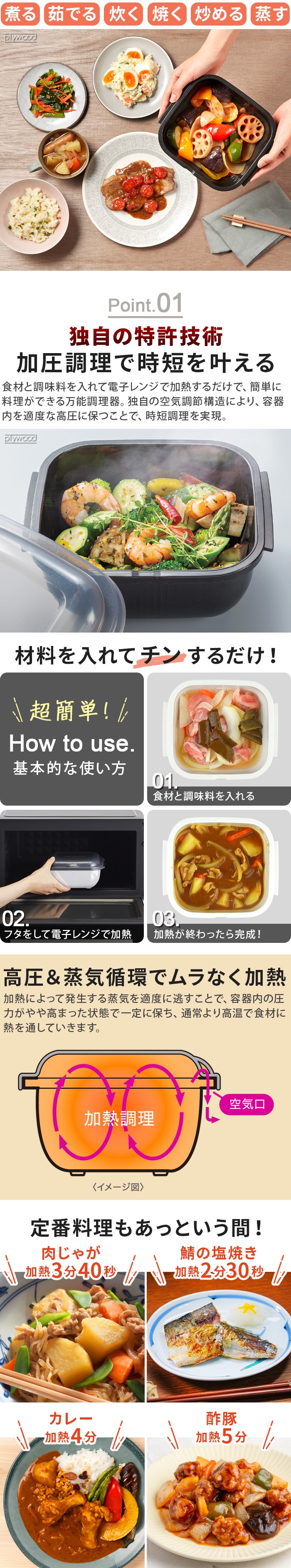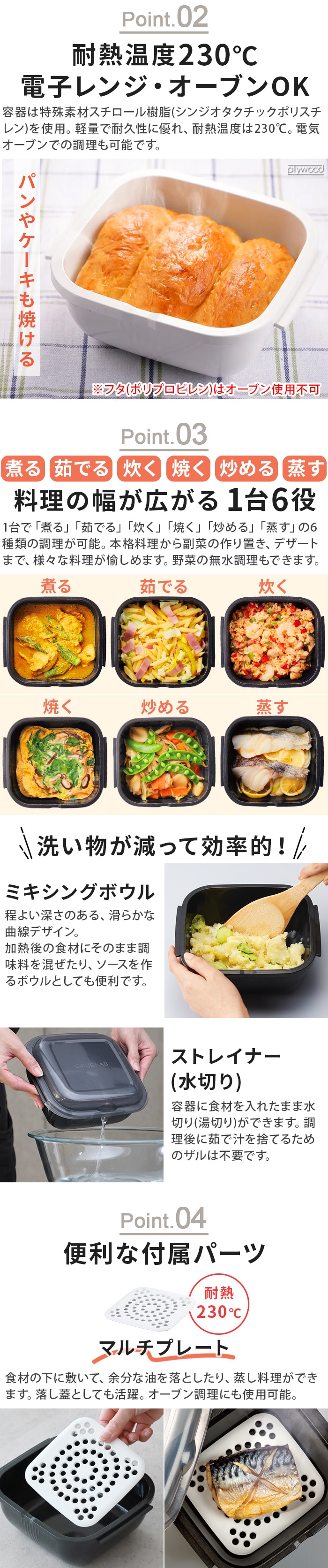 | 独自の加圧構造時短調理 電子レンジ、オーブン対応 食洗機対応 ※フタ、コランダーはオーブンと食洗機使用不可 |