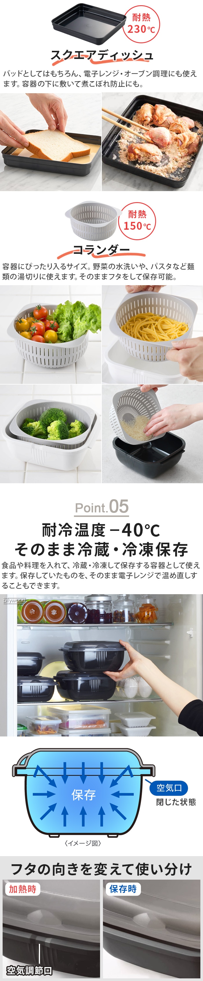 | フタ・コランダー: 耐熱温度 150℃/耐冷温度 -40℃ 大、小容器・スクエアディッシュ・マルチプレート: 耐熱温度 230℃/耐冷温度 -40℃ |