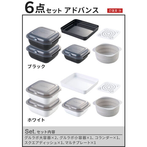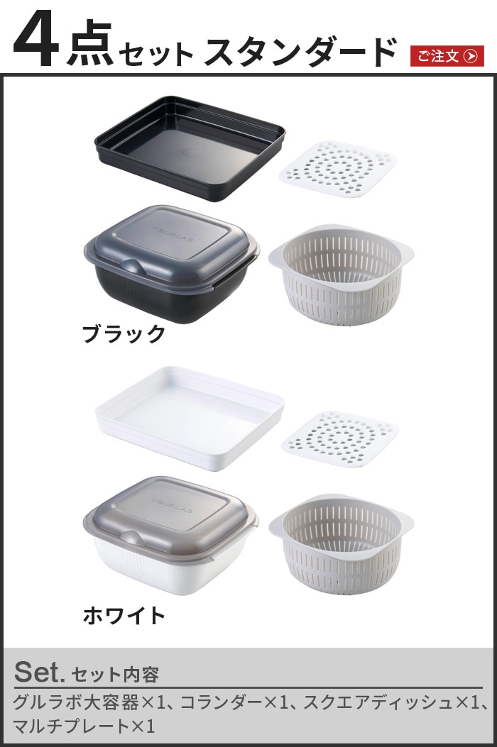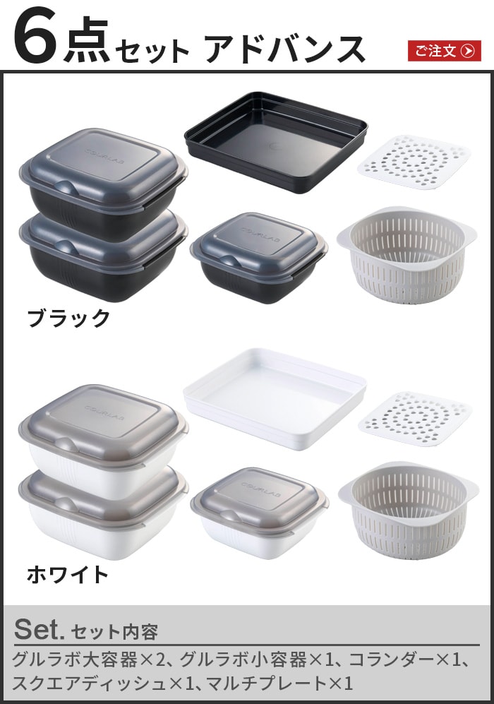 | アドバンス(6点セット) グルラボ・大容器×2、グルラボ・小容器×1、コランダー×1、スクエアディッシュ×1、マルチプレート×1 スタンダード(4点セット) グルラボ・大容器×1、コランダー×1、スクエアディッシュ×1、マルチプレート×1 |