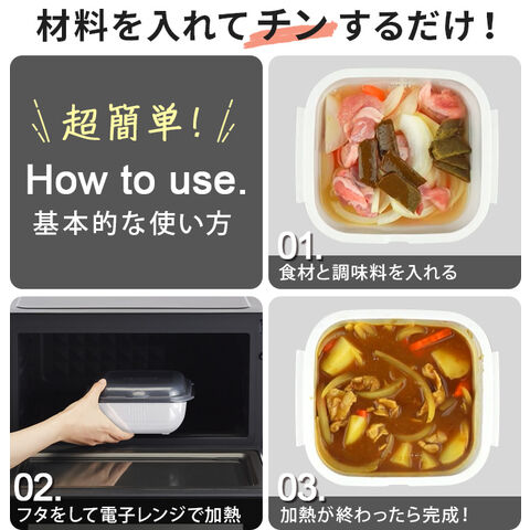 | 素材の特性上、お使い初めはフタが緩く感じられますが、数回レンジで加熱することで収縮します。 本品は密閉容器ではありません。 本品は電子レンジ加熱およびオーブン(電気式、設定温度が230℃以下に限る)加熱のみに使用できる調理器です。 レシピの加熱時間や調理方法は目安です。電子レンジの種類や使用年数によって、加熱時間が異なることがあります。 容器が空の状態で加熱しないでください。 自動調理機能は使用しないでください。(正しく調理できません)必ず手動でワット数と加熱時間を設定してください。 加熱後フタを開ける際は、高温の蒸気でやけどしないようお気をつけください。 オーブン加熱調理する場合必ずフタを外して使用してください。 加熱温度を設定できないオーブンでは使用しないでください。 |