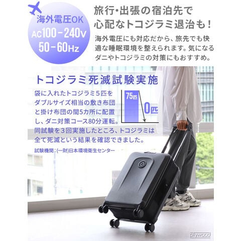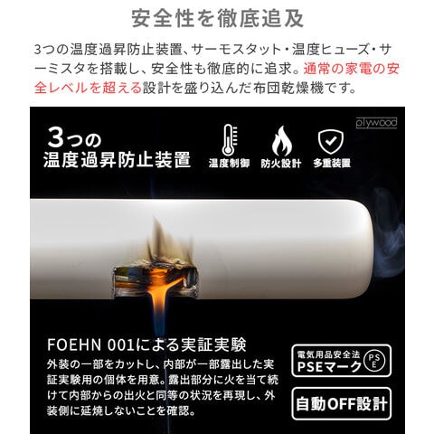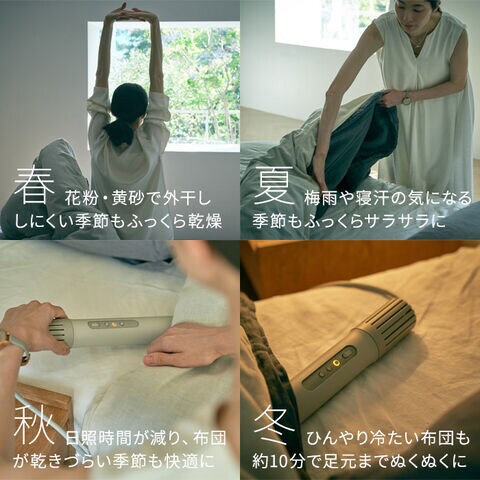 | ふとんの耐熱温度が70℃以上であることを確認してください。 特に機能性寝具( 低反発や高反発素材・ビーズ素材・パイプまくらなど)は温風の温度により機能を損なうことがありますので、必ず寝具メーカーに確認してください。 |
