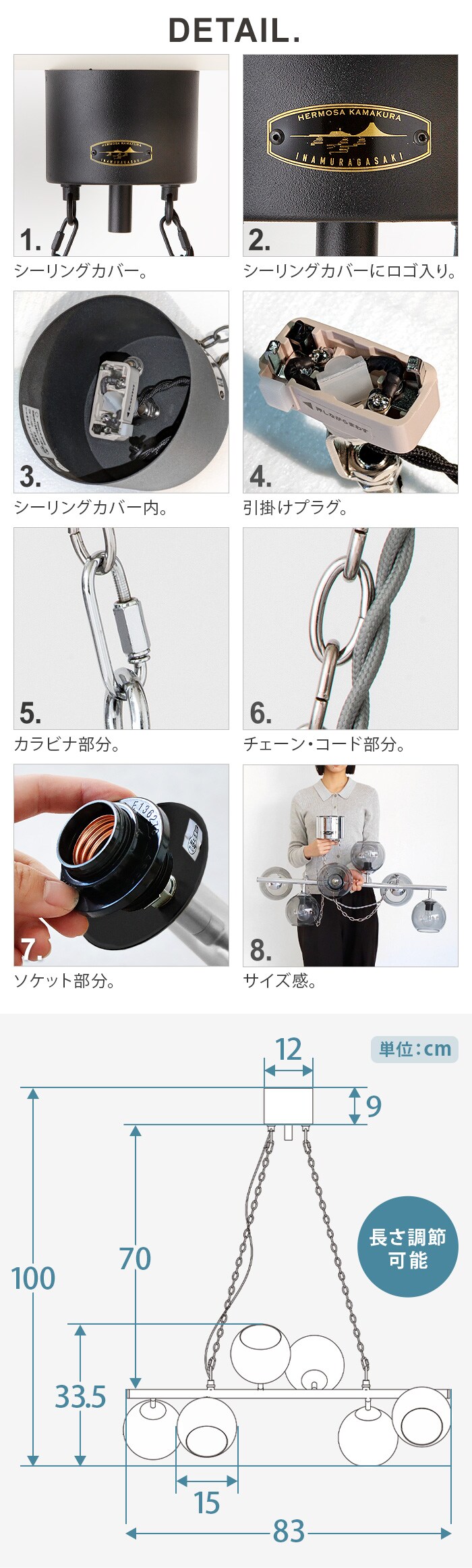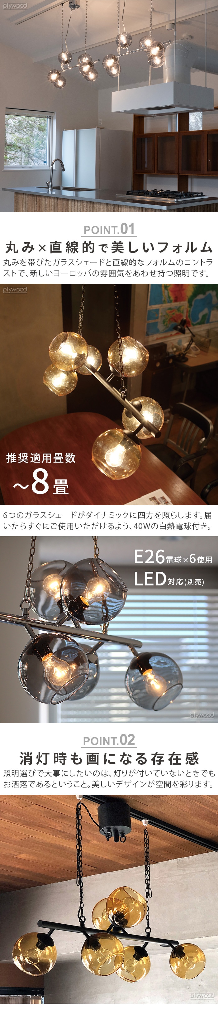 照明選びで大事にしたいのは灯りが付いていないときでもお洒落であるということ。そんな願いを叶えてくれるペンダントライト「BIARRITZ(ビアリッツ)」の登場です。四方を照らす丸みを帯びた6つのガラスシェードと、直線的なフォルムのコントラストで、新しいヨーロッパの雰囲気を演出。消灯時でも存在感があり、つい見とれてしまうようなデザインです。チェーンは長さ調節可能。付属の白熱電球の他、LED電球も対応です。