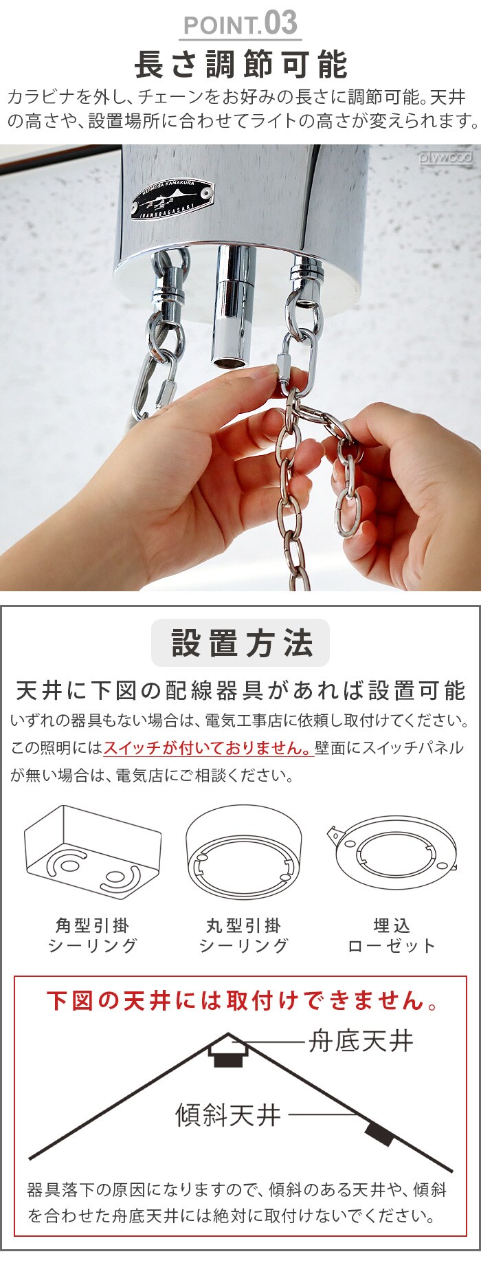 器具を取り付ける天井の強度を確認し、重量に耐えられる事を確認して下さい。