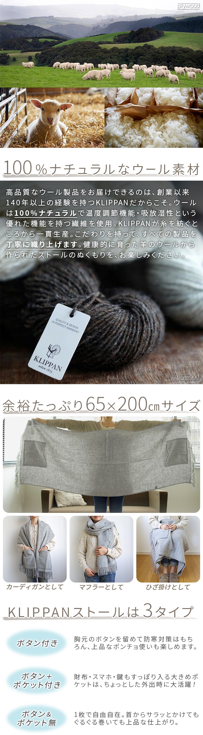 ![]() マルチに使える大判ストール およそ140年に渡り、生産者や動物たち、そして地球環境や私たちの健康を守る「サステナブル」なものづくりを続けるKLIPPAN。 一貫して「天然繊維」「アニマルウェルフェア」「オーガニック」にこだわり、エネルギー消費を抑えながらひとつひとつ丁寧に織り上げられた、使い心地の良いストールです。 大切な方へのギフトにも◎。 ![]() ![]() ![]() ![]() ![]() ![]() ![]() ![]() ![]() ![]() ![]() ![]() ![]() ![]()