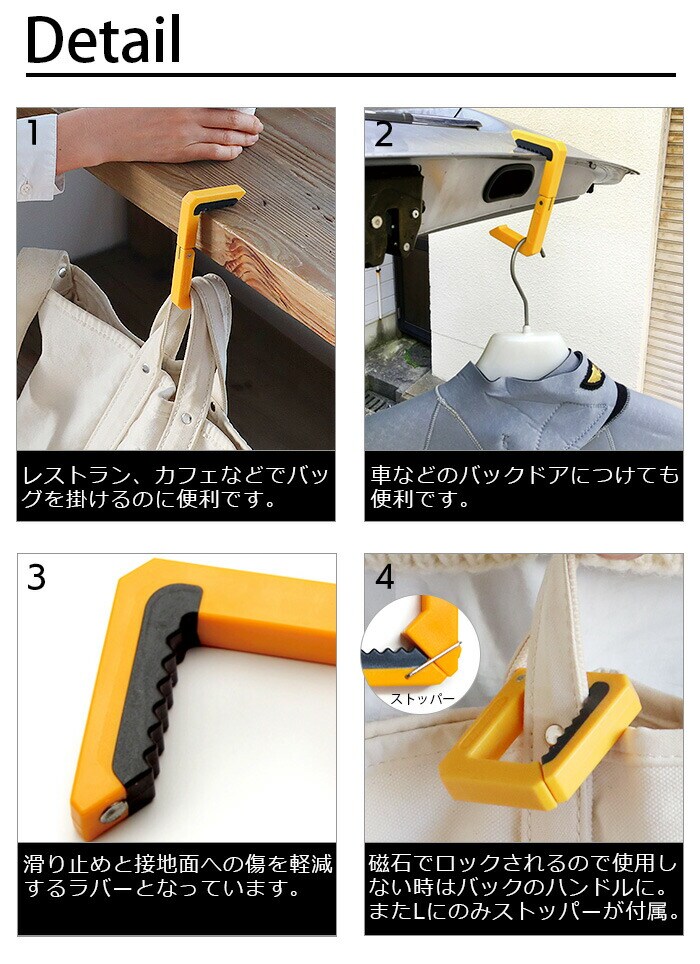 | テーブル板の厚さ・形状、バッグのハンドルの幅などによって使用出来ない場合があります。 バッグハンガーは出来るだけ奥で固定してください。 耐荷重を超える物を掛けないでください。 取り付け後、本体がしっかり固定されているかご確認の上、ご使用ください。 本体に強く引っ張る・ねじる等の無理な力を加えないでください。 思わぬ衝撃や振動でテーブルから外れる場合があります。貴重品やこわれものが入っているバッグを掛ける際は十分にご注意ください。 磁石を使用しているので、磁器の影響を受けやすい電子機器などには近づけないでください。 その他、本来の使用用途から外れるご使用はお止めください。 |