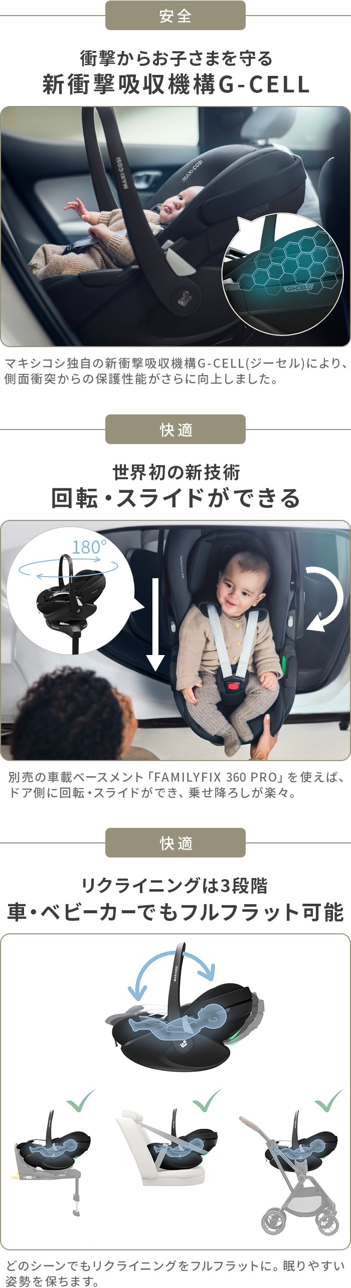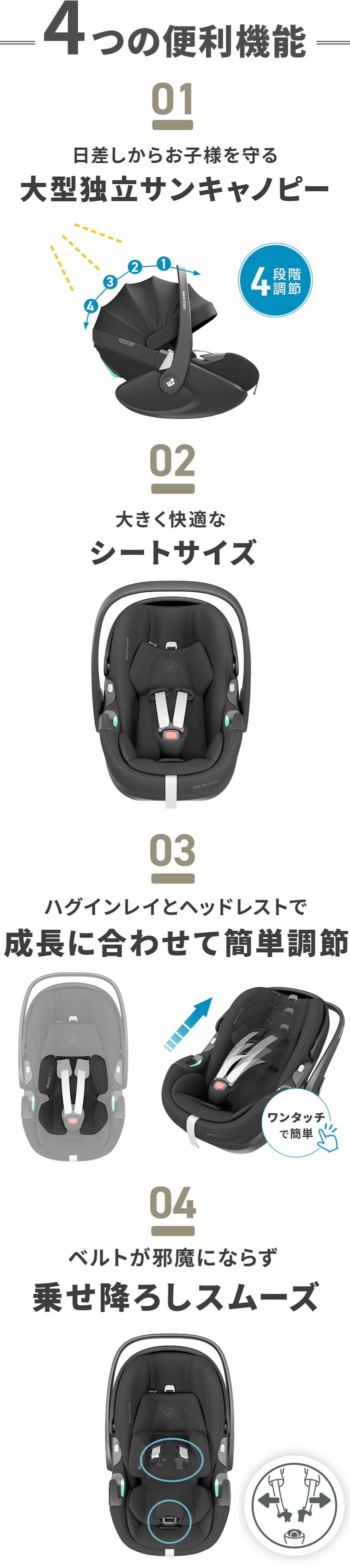 オランダ生まれマキシコシのベビーシート Newモデル登場! 世界中のセレブが愛用するブランドMaxi-Cosi(マキシコシ)の人気シリーズ「PEBBLE 360 PRO(ペブル360 プロ)」に、オープンメッシュ素材を追加し、通気性を高めた新モデルが登場!「スライドすれば乗せ降ろしはもっと楽になる。」世界初の新技術スライドテック搭載のベースメント ファミリーフィックス360プロ(別売) に対応した、最新チャイルドシートです。もちろん、シートベルトでの固定もOK。先進の安全性と使いやすさ、快適性をぜひ体感してください。 ※ベビーシート本体単品ページです。専用ベースメントは別売です。 |