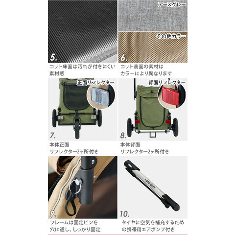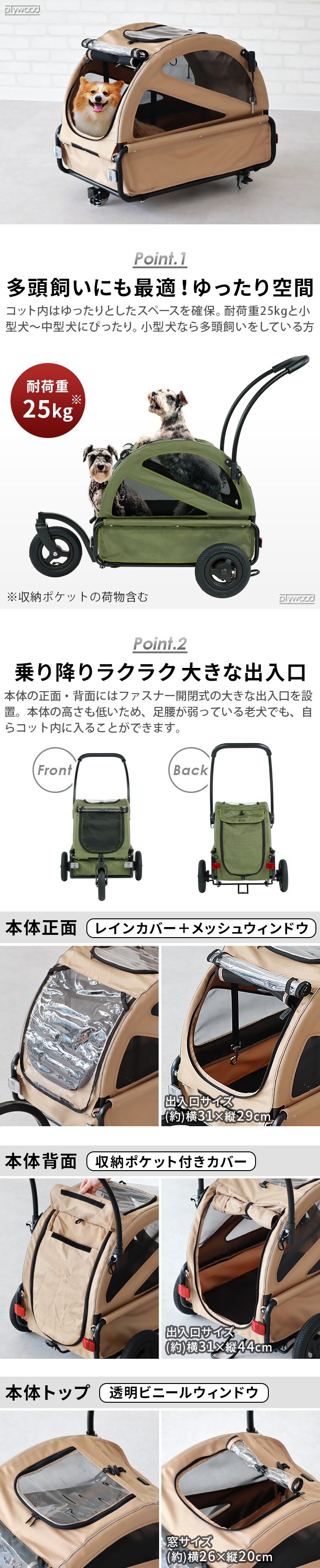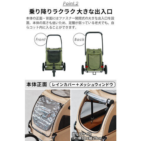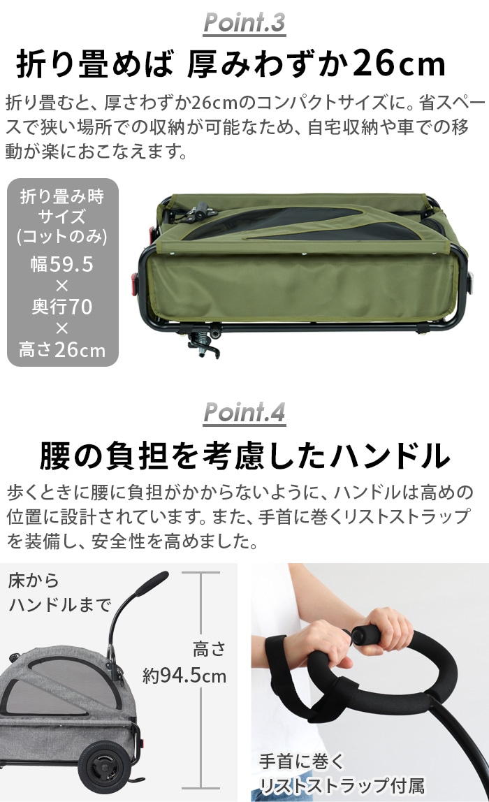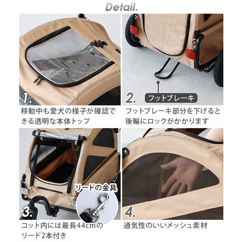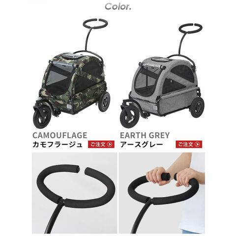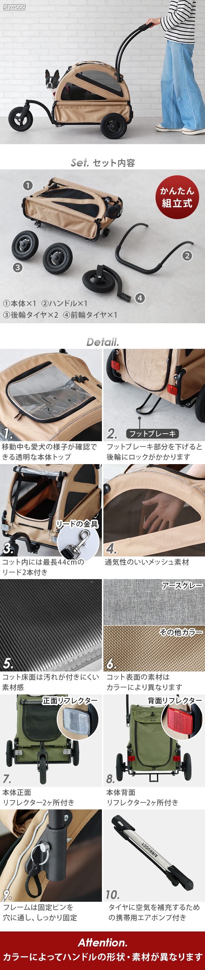 | カラーによってハンドルの形状・素材が異なります。 1ヶ月に1回程度、付属のエアポンプでタイヤに空気を入れてください。 シートを洗濯機で洗ったり、乾燥機を使用することはできません。 コット(シート)は水で濡らし固く絞った布で汚れを拭き取ってください。 使用中は愛犬から目を離さないでください。本製品に愛犬を乗せたまま長時間本製品から離れることは危険ですので絶対におやめください。 本品はドッグ専用です。ドッグ以外の荷物や人を乗せて使用することは転倒や転落の危険が高まりますので絶対におやめください。 愛犬の飛び出しや転落を防ぐために必ずコット内のリードを愛犬に繋げてください。 本製品に愛犬を乗せる際は、必ずフットブレーキで後輪を固定して、本製品が動かない状態にしてから乗せてください。 本製品は適切な歩行速度でご使用ください。 ジョギングやマラソン。自転車やバイク、ローラースケートなど、歩行速度以上で使用すると本製品が転倒するおそれがあり、大変危険ですので絶対におやめください |