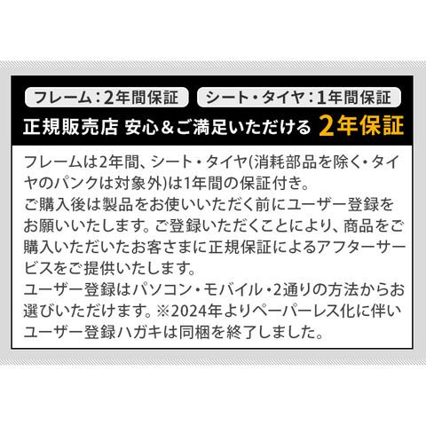 | フレーム:お買い上げ日より2年間 タイヤ・コット(シート):お買い上げ日より1年間 (消耗部品を除く、タイヤ・チューブは対象外) 保証対象製品には正規保証によるアフターサービスをご提供させていただきます。ご購入後は製品をお使いいただく前にユーザー登録をお願い致します。ご登録いただくことにより、ユーザー様へ正規保証によるアフターサービスをご提供させていただきます。 ※2024年よりペーパーレス化に伴いユーザー登録ハガキは同梱を終了しました。 |