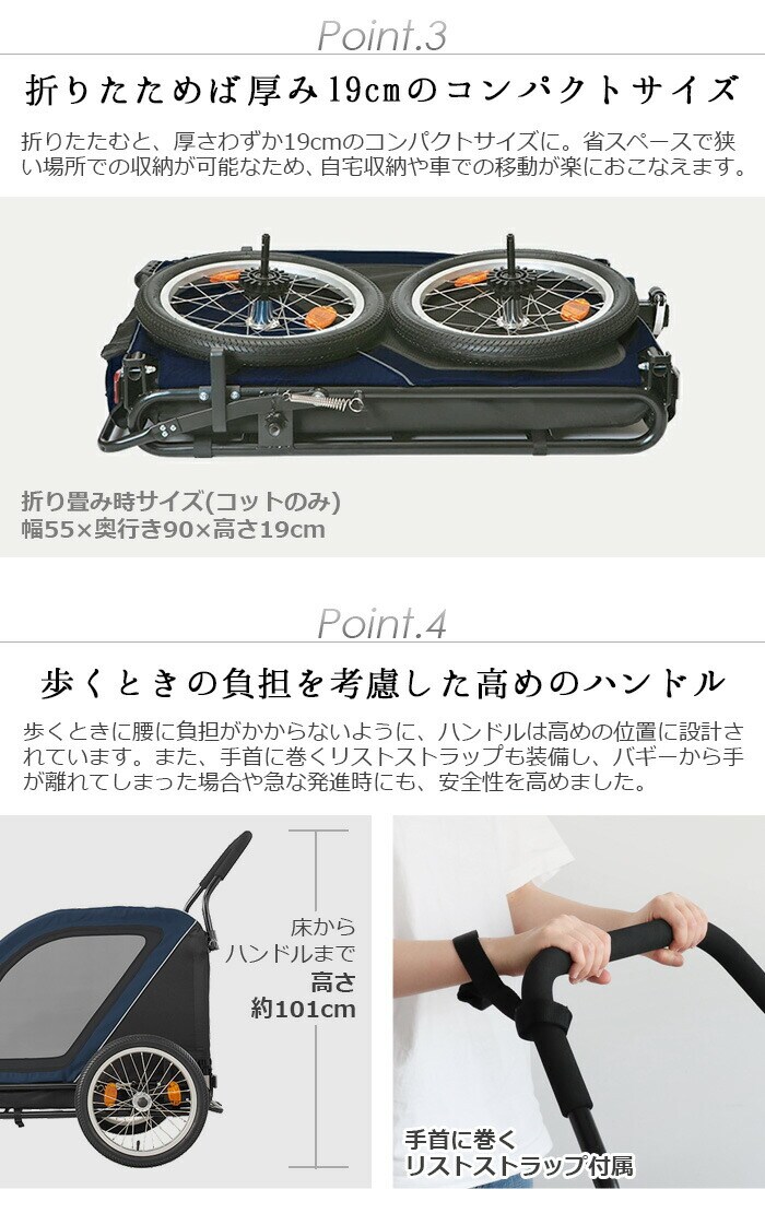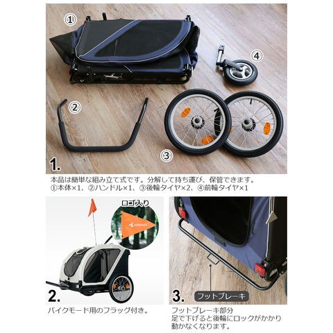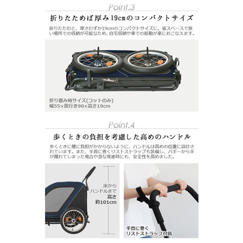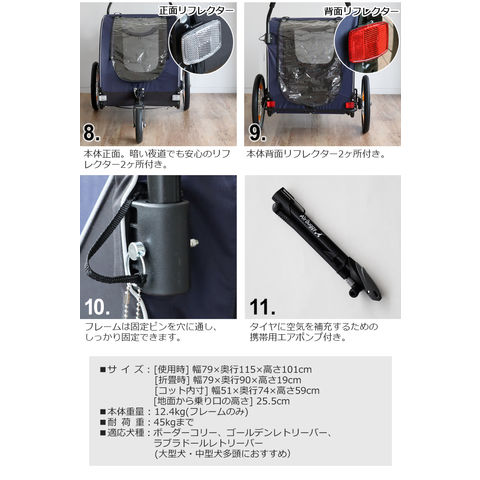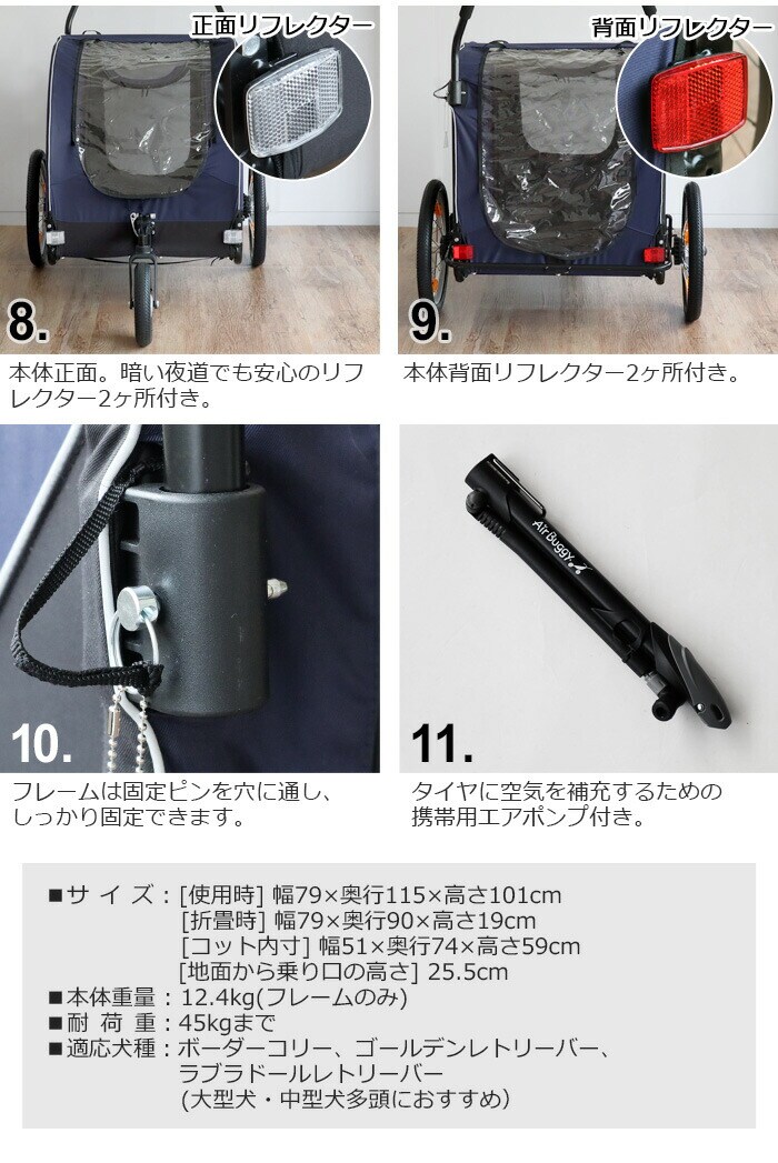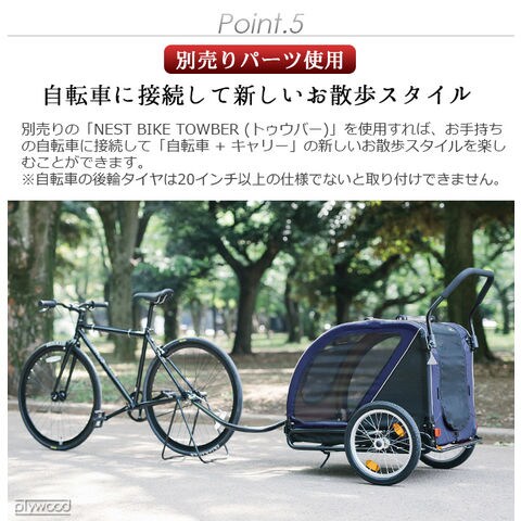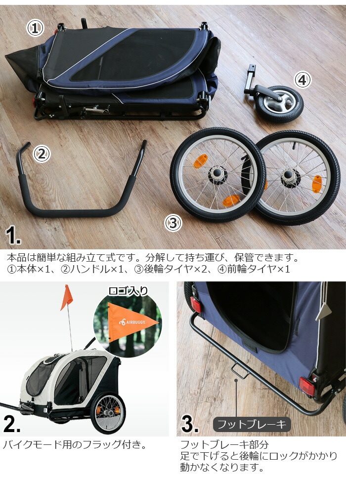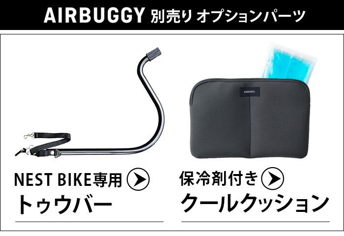 | 自転車と接続する際は、別売りのNEST BIKE専用ジョイントパーツ「NEST BIKE TOWBAR 」をご使用ください。 本製品はペットカート以外にベビーカー・ショッピングバスケットとしても利用可能な「AirBuggy 3in1」には対応しておりません。 1ヶ月に1回程度、付属のエアポンプでタイヤに空気を入れてください。 シートを洗濯機で洗ったり、乾燥機を使用することはできません。 コット(シート)は水で濡らし固く絞った布で汚れを拭き取ってください。 使用中は愛犬から目を離さないでください。本製品に愛犬を乗せたまま長時間本製品から離れることは危険ですので絶対におやめください。 本品はドッグ専用です。ドッグ以外の荷物や人を乗せて使用することは転倒や転落の危険が高まりますので絶対におやめください。 愛犬の飛び出しや転落を防ぐために必ずコット内のリードを愛犬に繋げてください。 本製品に愛犬を乗せる際は、必ずフットブレーキで後輪を固定して、本製品が動かない状態にしてから乗せてください。 本製品は適切な歩行速度でご使用ください。 ジョギングやマラソン。自転車やバイク、ローラースケートなど、歩行速度以上で使用すると本製品が転倒するおそれがあり、大変危険ですので絶対におやめください |