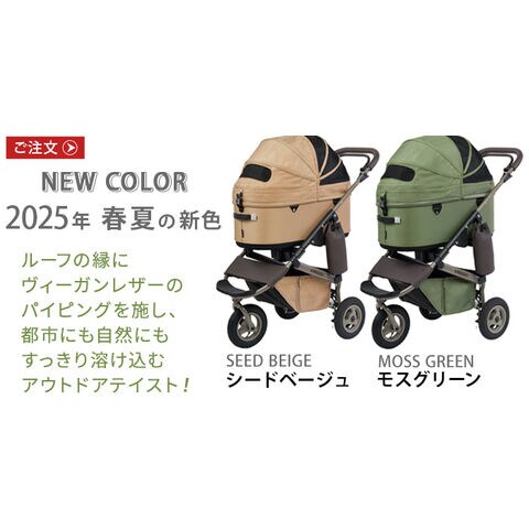 より大きな犬種にも対応 進化したDOME3で 愛犬や愛猫との お出かけを楽しく快適に 大切な愛犬や愛猫を安心・快適に運べるペットカートAIRBUGGY PET(エアバギーペット)のご紹介です。AIRBUGGYはペットカートもひとつの 「クルマ」であると考えています。クルマである以上、乗り心地、 走りやすさ、安全性は絶対条件。だから、振動吸収のエアチューブタイヤ、3角構造で実現した安定感と、重量に負けない頑丈なフレーム、信頼の日本ブランドKARASAWA製のハンドブレーキを搭載し、快適な乗り心地を実現しました。コット(本体)はフレームから取り外しも可能で掃除しやすく、いつでも衛生的に。世界的な安全基準である欧州安全基準[EN188-2]も取得。そのハイクオリティーさから、芸能人やセレブにも愛用されているブランドです。持ち運びは両手のハンドルで安全に。 |