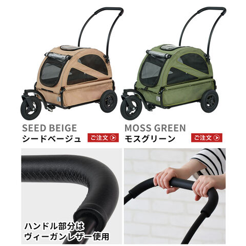 | カラーによってハンドルの形状・素材が異なります。 1ヶ月に1回程度、付属のエアポンプでタイヤに空気を入れてください。 シートを洗濯機で洗ったり、乾燥機を使用することはできません。 コット(シート)は水で濡らし固く絞った布で汚れを拭き取ってください。 使用中は愛犬から目を離さないでください。本製品に愛犬を乗せたまま長時間本製品から離れることは危険ですので絶対におやめください。 本品はドッグ専用です。ドッグ以外の荷物や人を乗せて使用することは転倒や転落の危険が高まりますので絶対におやめください。 愛犬の飛び出しや転落を防ぐために必ずコット内のリードを愛犬に繋げてください。 本製品に愛犬を乗せる際は、必ずフットブレーキで後輪を固定して、本製品が動かない状態にしてから乗せてください。 本製品は適切な歩行速度でご使用ください。 ジョギングやマラソン。自転車やバイク、ローラースケートなど、歩行速度以上で使用すると本製品が転倒するおそれがあり、大変危険ですので絶対におやめください |