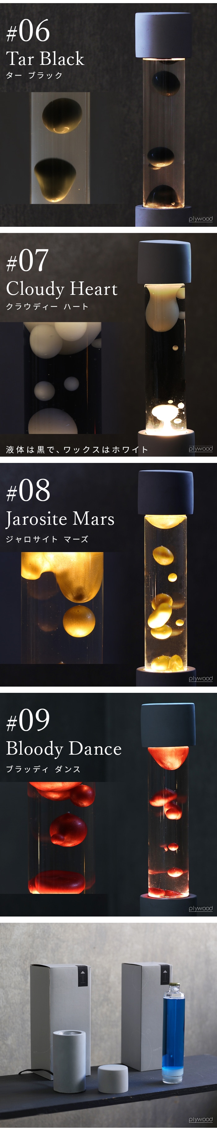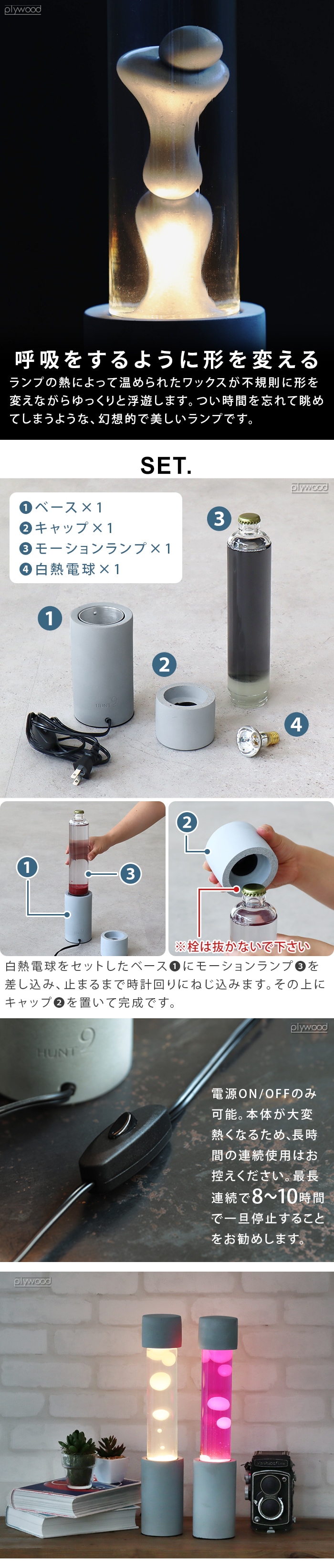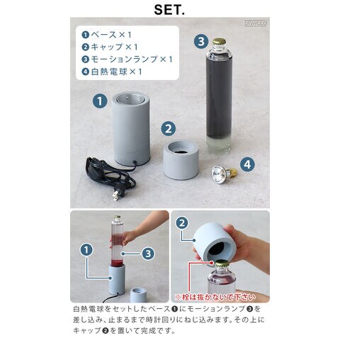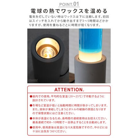 屋内での使用、平均的な室温(20-25℃)で作動するように設計されています。 冬場など室温が低いと始動時間に時間が掛かってしまいます。また液体が凍結してしまうとボトルの破損の原因となりますので保管状態にはご注意ください。 本体が高温になるため長時間の連続使用はお控えください。(最長連続で約8-10時間で一旦停止することをお勧めいたします。) 使用中、使用直後は高温になり大変危険ですので、やけどには十分にお気をつけください。 点灯が確認できない場合は電球の取り付け直しを行ってください。(電球は中心で締めてください。) 初回のウォームアップにはスイッチを入れてから約3-5時間ほどかかり、ワックスが温まりきったあと上下運動が始まります。使用を重ねることでワックスが馴染み、ウォームアップの時間も徐々に短くなってきます。 開封時に水が濁っている場合は、濁りがなくなるまで電源を付けずにしばらくお待ちください。 本製品は使用後に水が濁る可能性があります。濁った場合は電源を切り、しっかりと冷ましてから再度電源を付けてください。 完全に無色透明の状態が持続するわけではございません。濁りが気になる方はご購入をお控えください。 子供やペットの手の届かないところでご使用ください。 室温環境内でのみ使用してください。また直射日光はお避けください。 正しくない方法での加熱、故意的な冷却をしないでください。 モーションランプの容器上部のスペースは、中身が膨張した場合のためのものです。液体や固体を充填しないでください。 ※ウォームアップ中に、ヒートコイルが上部に浮いてきた場合はランプの操作を4 時間以上続け、正しく下げる必要があります。それでもコイルが下がらない場合は、容器を静かに回転させてください。 |