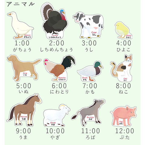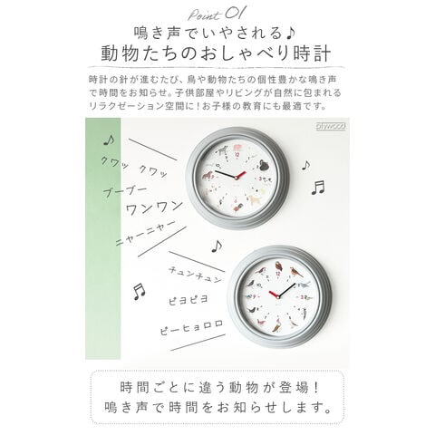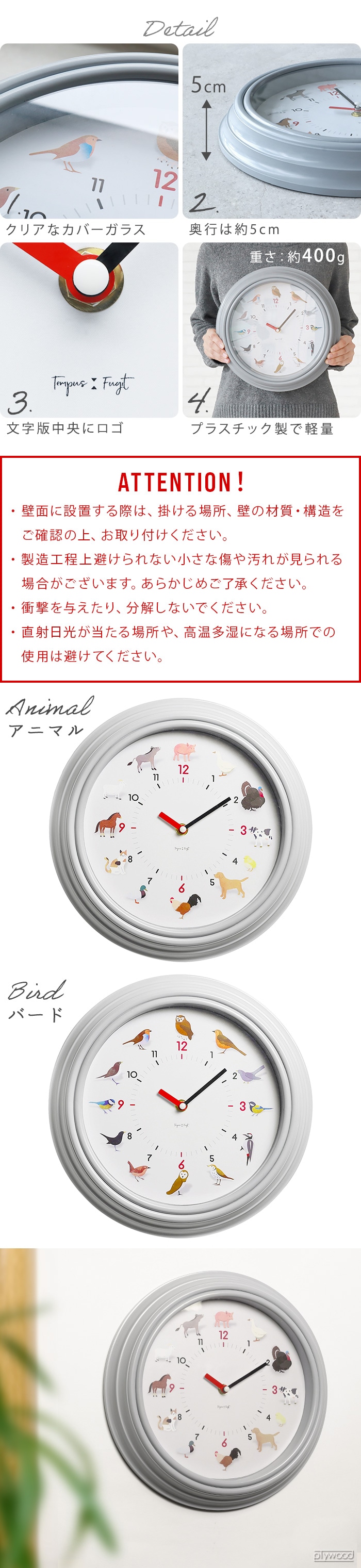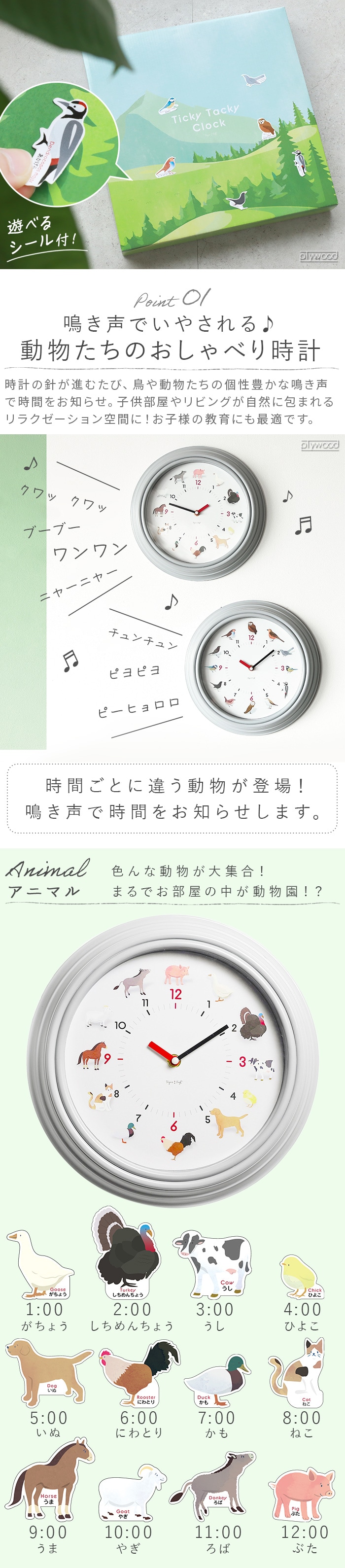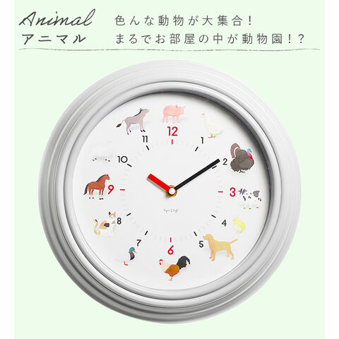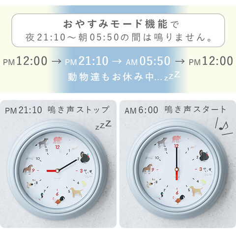 | 壁掛け専用 動物の鳴き声で時間をお知らせします おやすみモード搭載(21:10-5:50の間は鳴りません) 鳴き声用の電池のみ外せば音声無しの時計として使用可 パッケージに貼って遊べる動物シール付き |