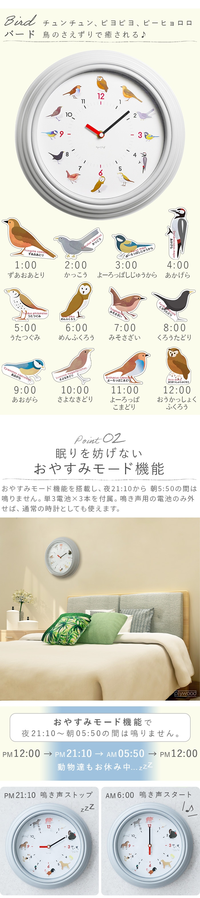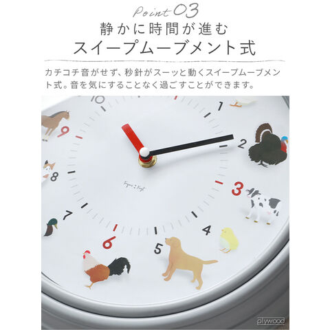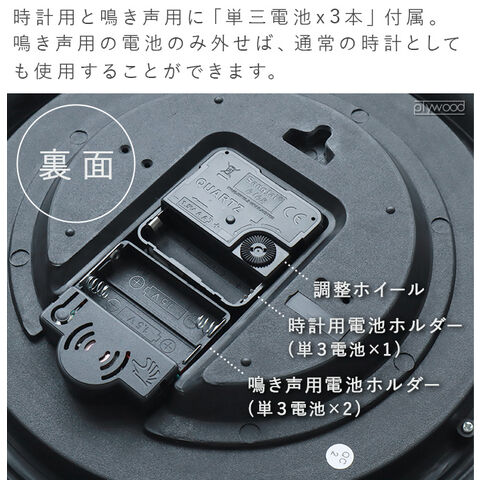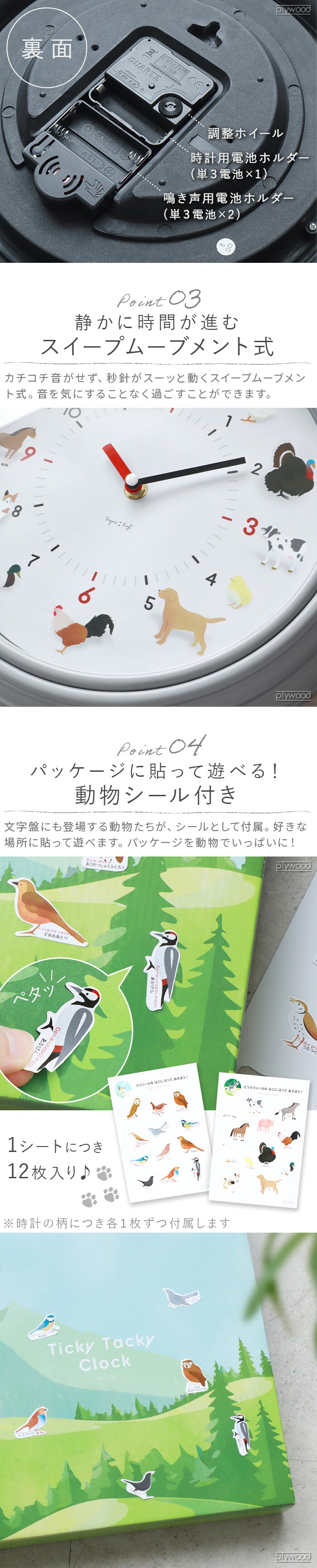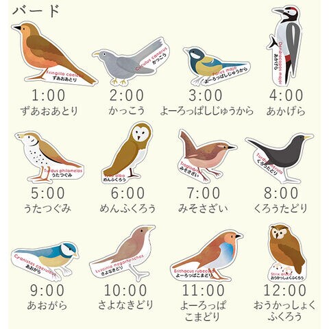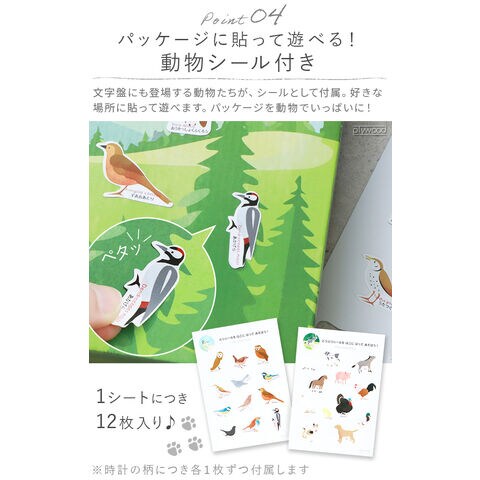 | 壁掛け専用 動物の鳴き声で時間をお知らせします おやすみモード搭載(21:10-5:50の間は鳴りません) 鳴き声用の電池のみ外せば音声無しの時計として使用可 パッケージに貼って遊べる動物シール付き |