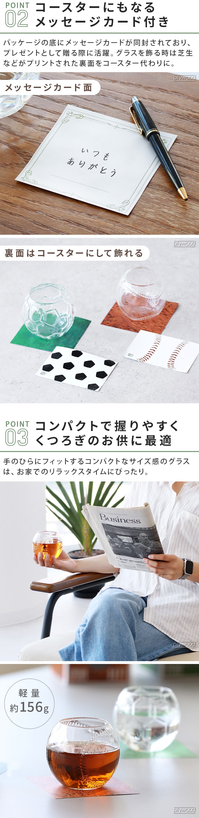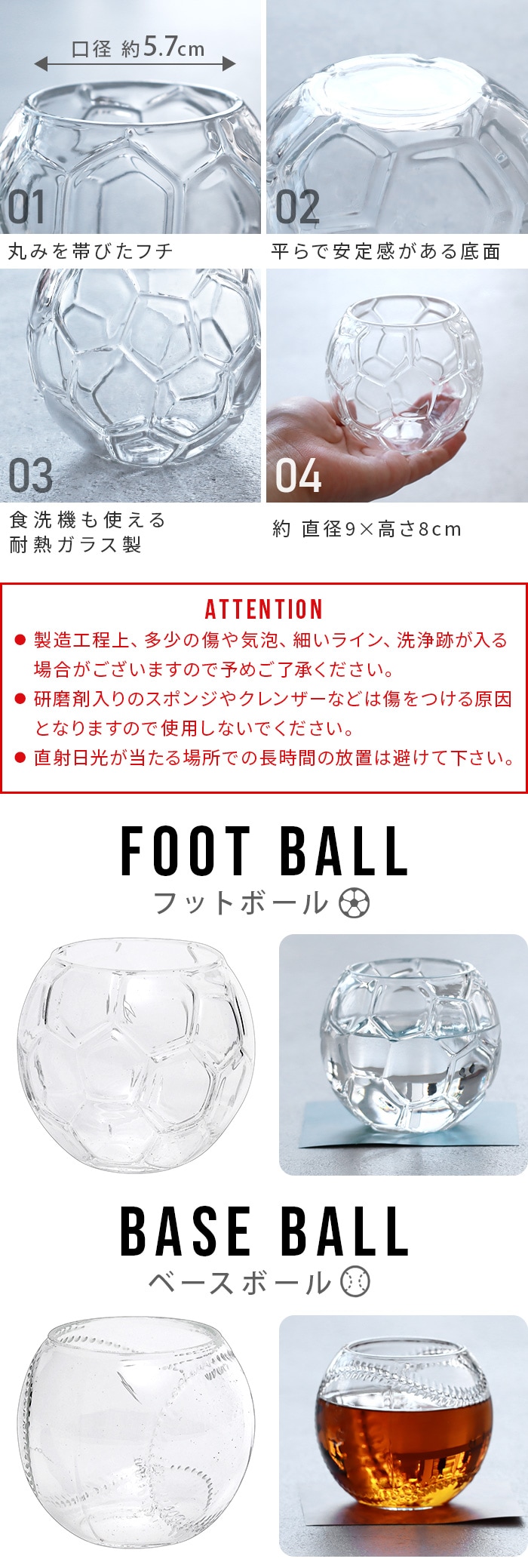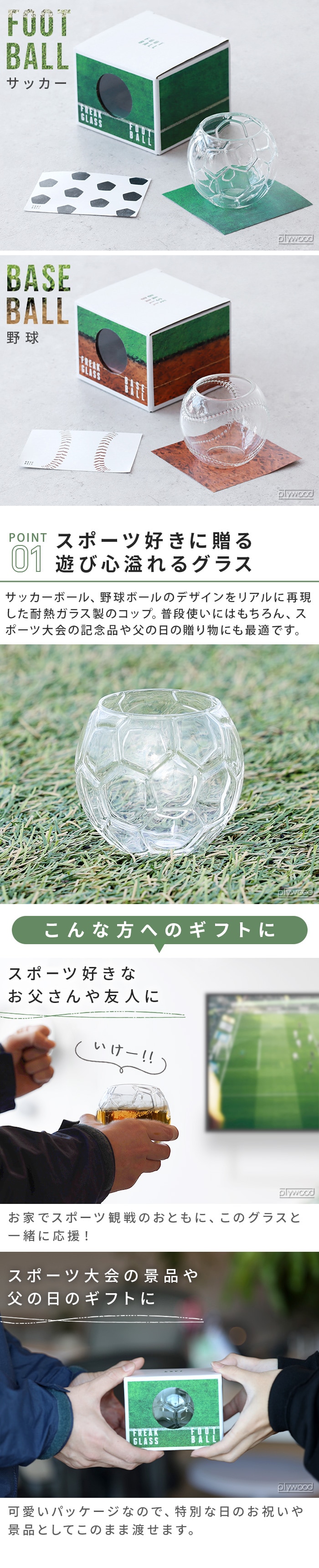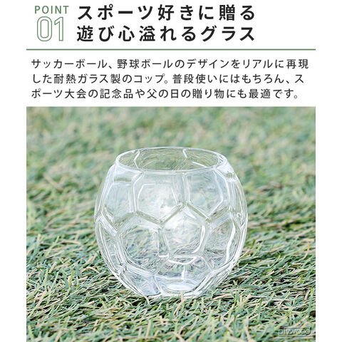 ボール柄のユニークなグラス スポーツファンやアスリートに喜ばれる、遊び心あふれるグラス。サッカーボール、野球ボールのデザインをリアルに再現しました。耐熱ガラス製で食洗機OK。メッセージが描けるコースター付きで、普段使いはもちろん記念品や贈り物としても最適です。コンペ・スポーツ大会の景品や、父の日、誕生日プレゼントなど、特別なシーンにぴったりのアイテム。 |