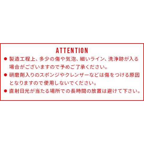 | ガラス製品のため取り扱いには十分ご注意ください。 ガラス製品は製造技法上、同じ商品でも個体差がございます。 製造工程上、多少の傷や気泡、細いライン、洗浄跡が入る場合がございますので予めご了承ください。 研磨剤入りのスポンジやクレンザーなどは傷をつける原因となりますので使用しないでください。 高価なものの近くや、小さな子どもやペットの手の届かない場所に保管してください。 直射日光が当たる場所での長時間の放置は避けてください。 上記の内容が原因での破損、事故、損害等についての責任は負いかねますのであらかじめご了承ください。 |